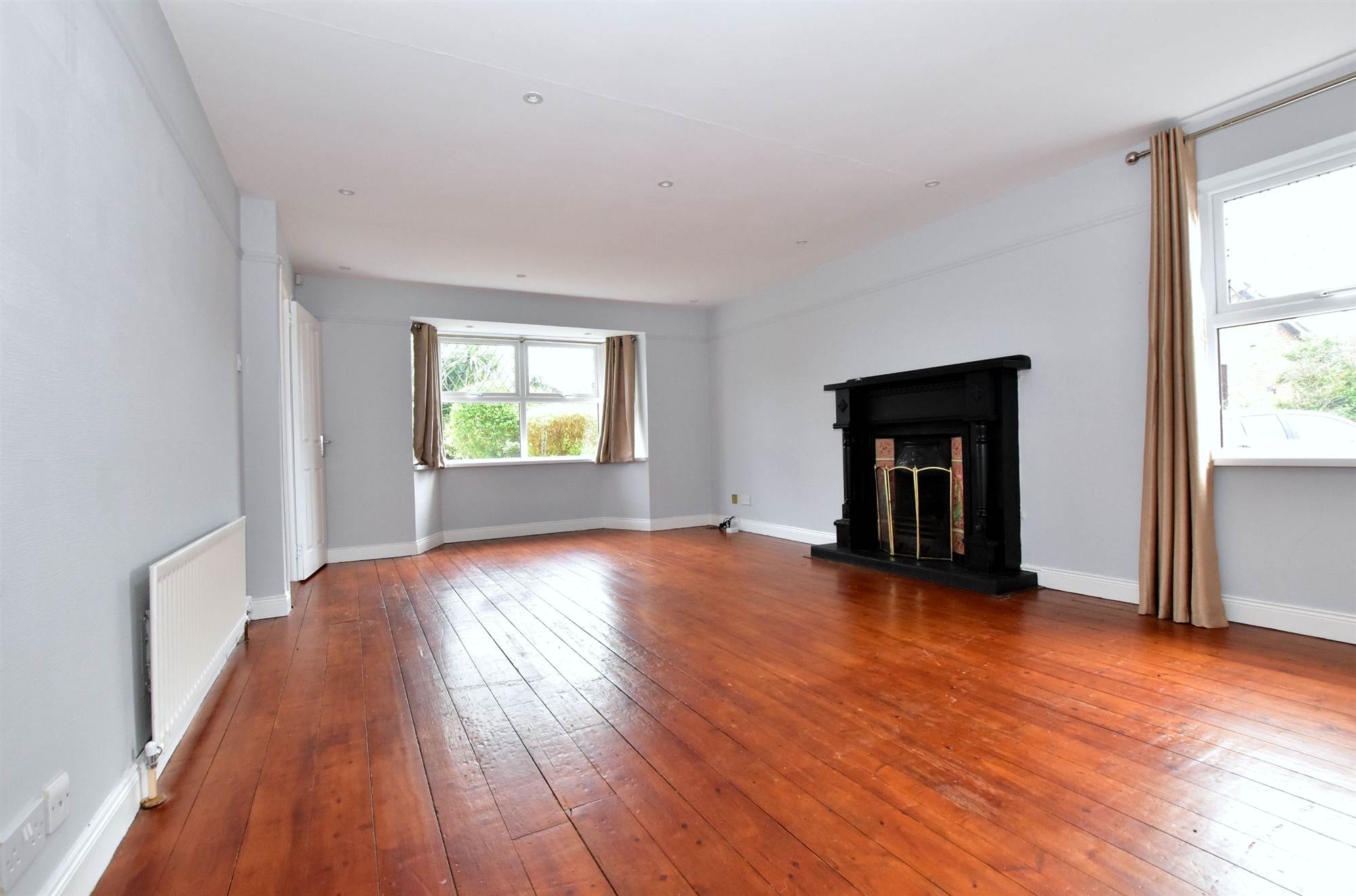 Carved wood surround, cast iron and picture tiled inset, tiled hearth, polished wood floor.