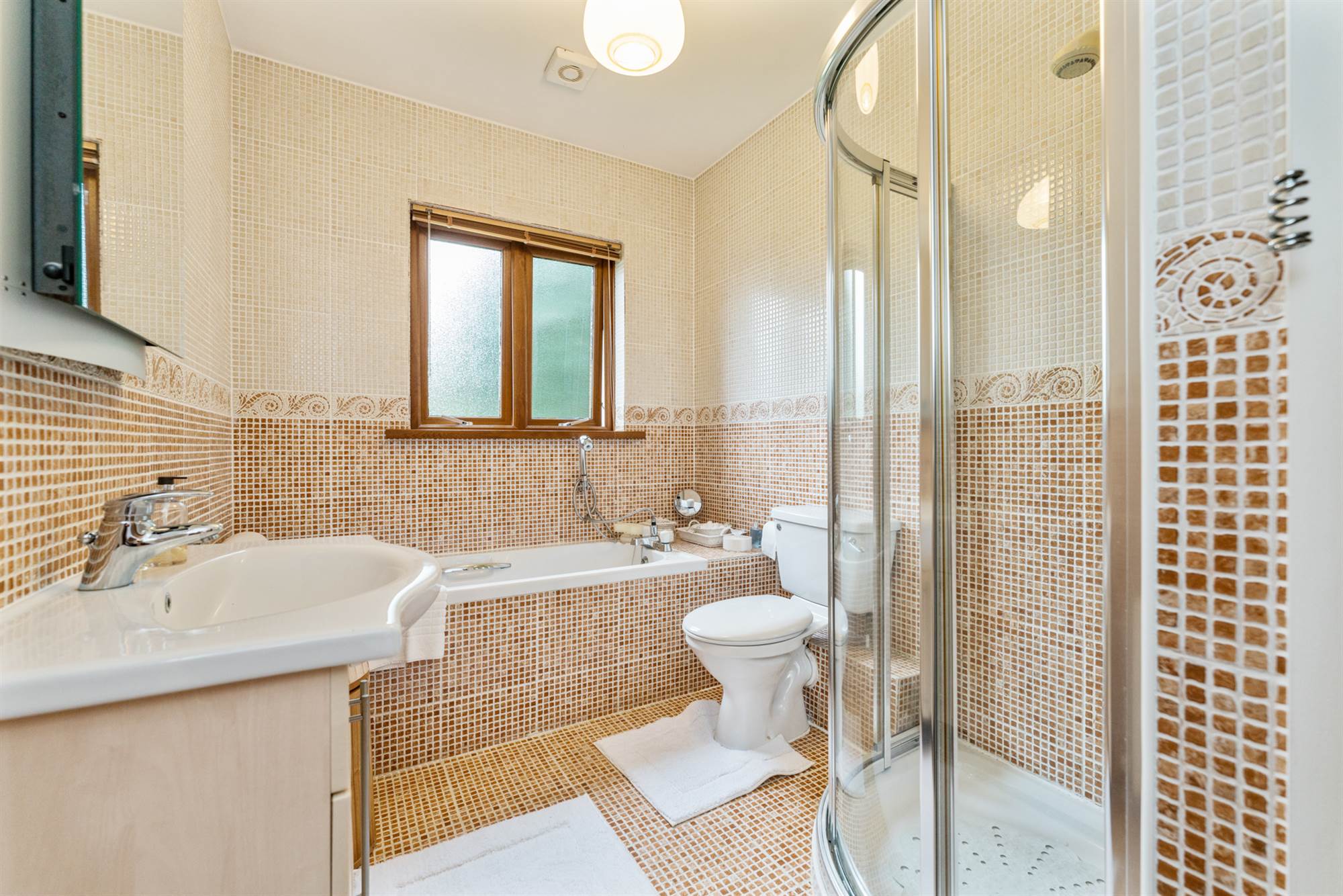 Modern white suite comprising: Panelled bath with mixer taps and telephone hand shower over, separate fully tiled shower cubicle with Mira sport thermostatically controlled shower, vanity sink unit with mixer taps, low flush WC, fully tiled walls, ceramic tiled floor, extractor fan, concealed hotpress with copper cylinder and immersion heater.