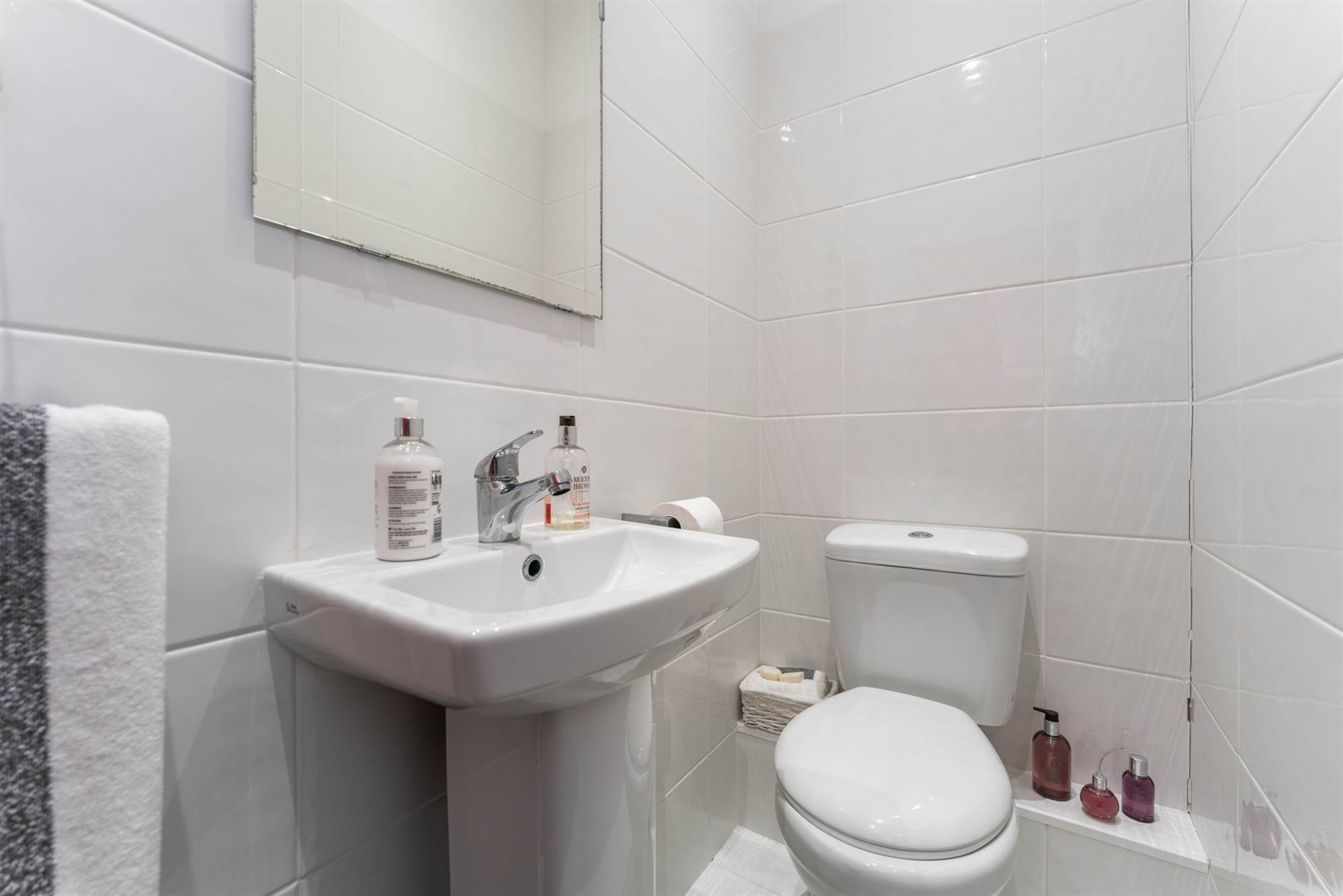 Modern white suite comprising: Push button WC, pedestal wash hand basin with mixer taps, fully tiled walls, ceramic tiled floor, extractor fan, LED recessed spotlighting.