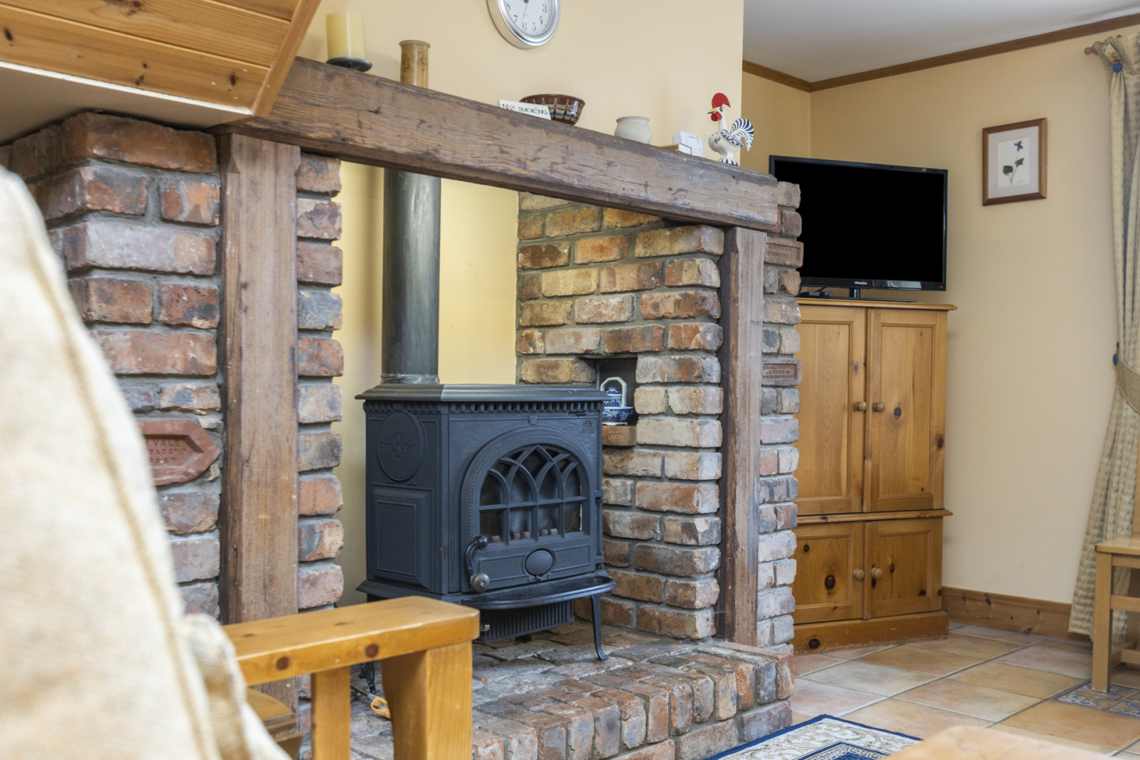 In the living area - cast iron wood-burning stove. In the kitchen area - full range of high and low level maple units. Stainless steel single drainer sink unit with mixer taps. 4 ring hob with under oven. Freezer. Dishwasher. Partially tiled walls. Ceramic tiled floor.