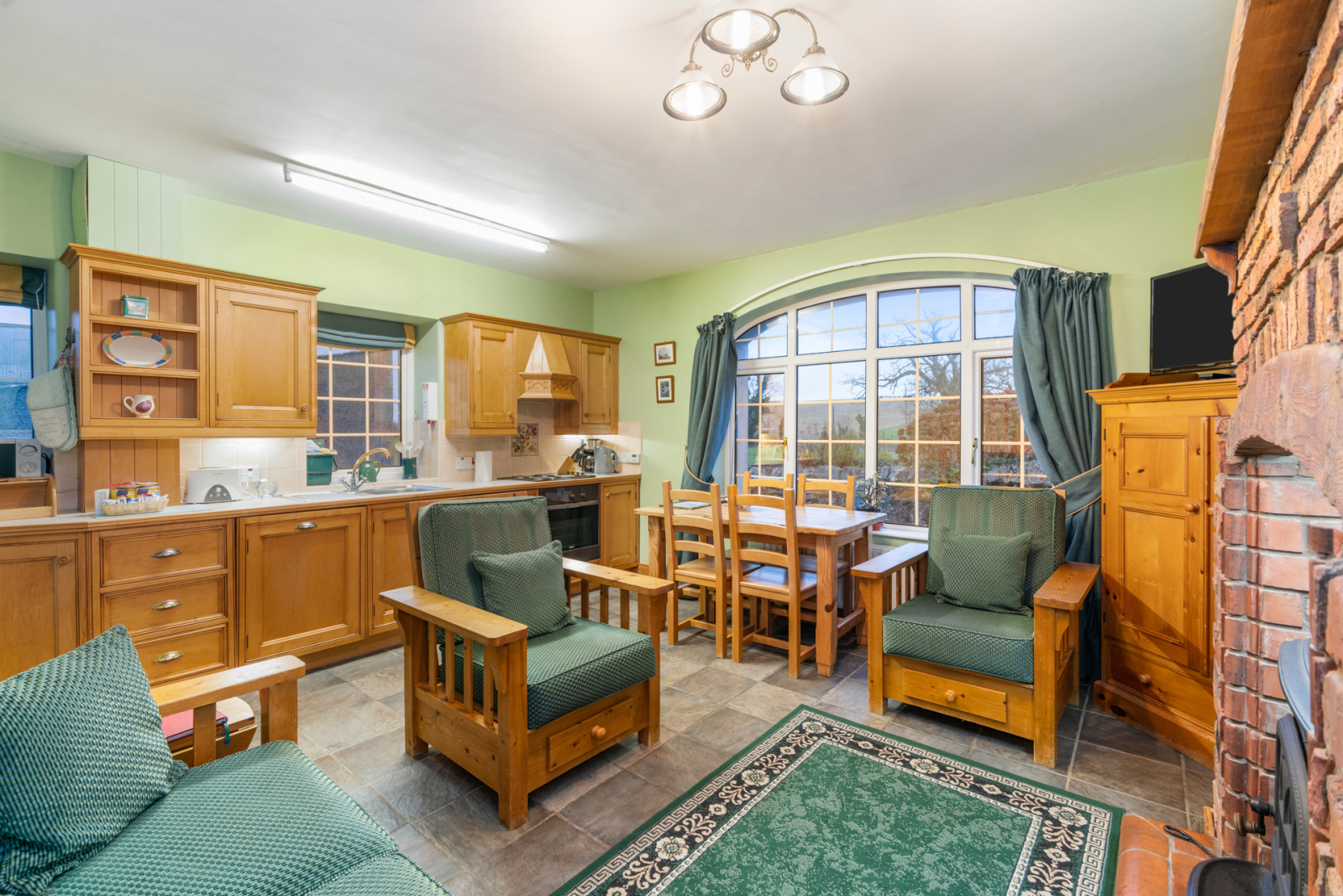 In the living area - `Morso´ wood-burning stove. In the kitchen area - full range of high and low level maple units. Stainless steel single drainer sink unit with mixer taps. 4 ring hob with under oven. Freezer. Dishwasher. Partially tiled walls. Ceramic tiled floor.