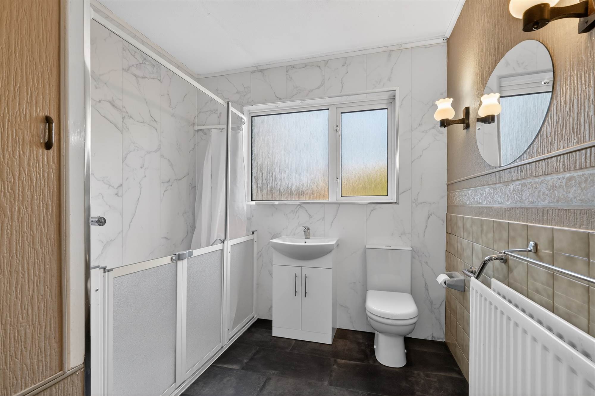 Shower cubicle with Triton electric shower unit, low flush wc, vanity unit.