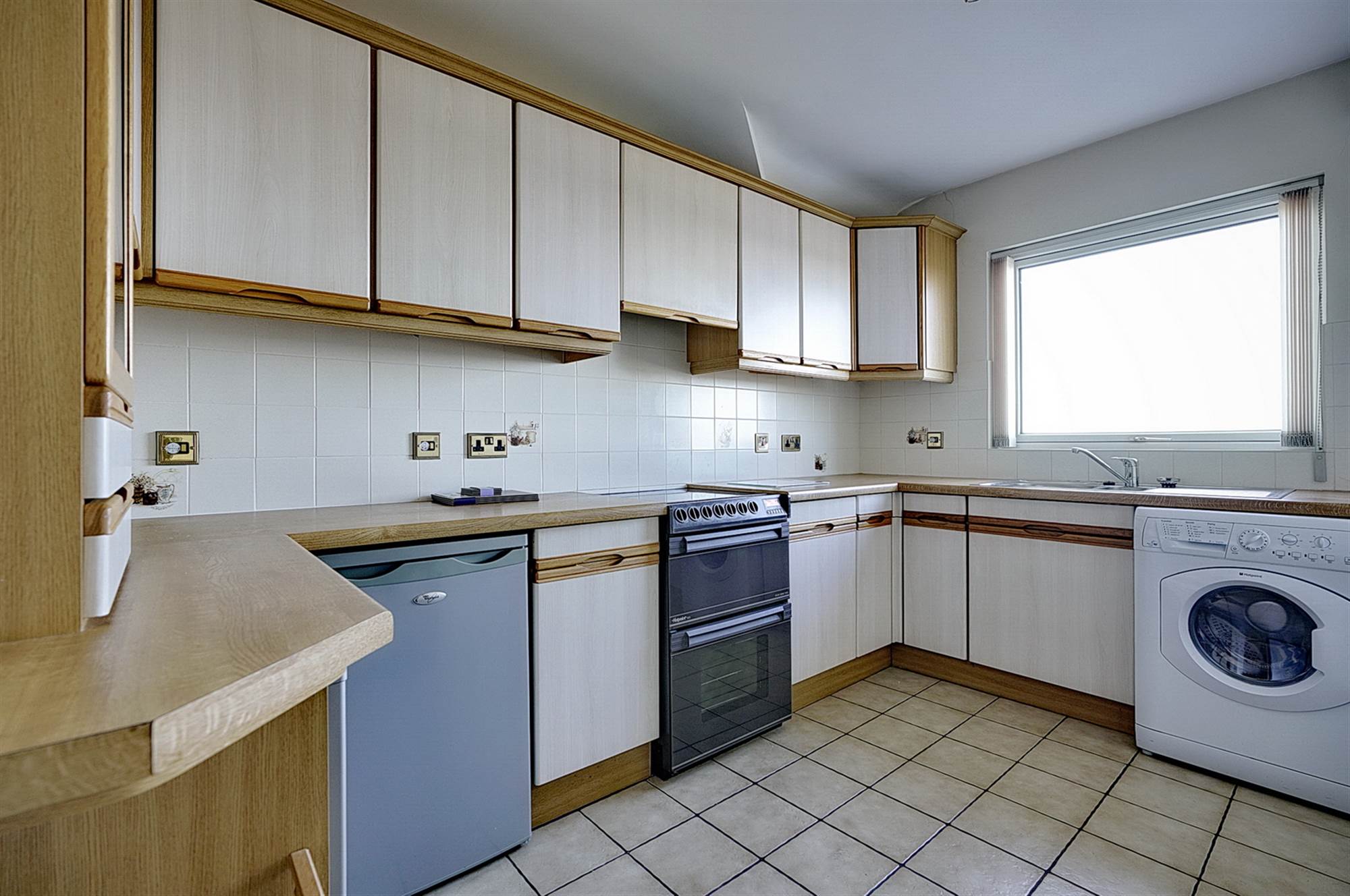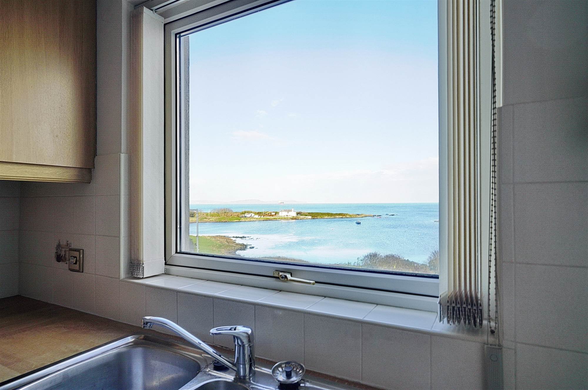 One and a half bowl single drainer stainless steel sink unit with mixer tap, range of high and low level units, formica round edge work surfaces, integrated extractor hood, wall tiling, tiled floor. Sea views over Groomsport Harbour and the Irish Sea.