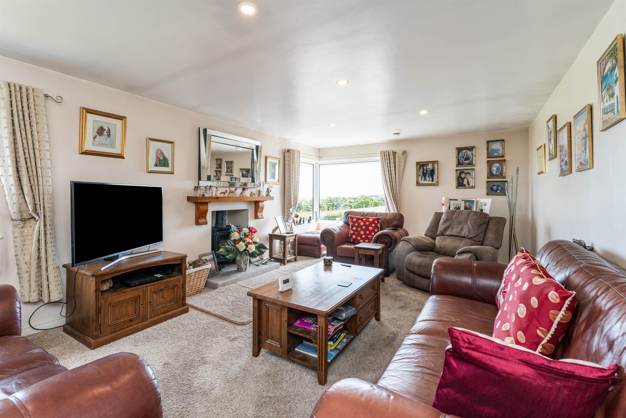 Lounge with feature multi fuel stove with views towards Belfast Lough and North Channel