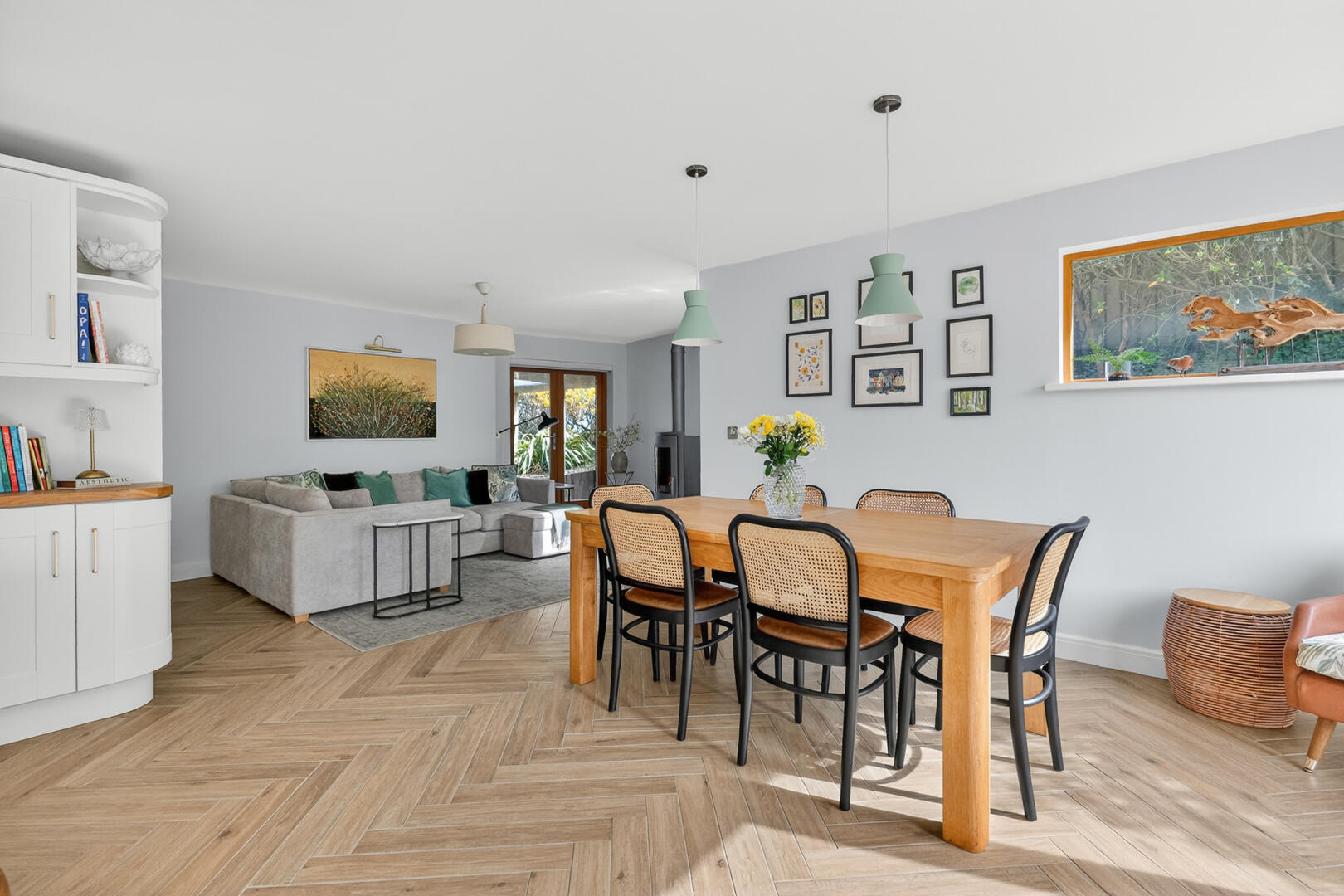 The ground floor includes a reception dining hall with French doors to the rear garden and a superb modern kitchen open plan to a casual dining/family area. The kitchen features bespoke hand-painted solid wood units, quartz worktops, a Quooker tap and integrated appliances. The family area includes a cast iron gas stove and herringbone flooring. A principal bedroom with built-in furniture and luxury en suite completes this level.