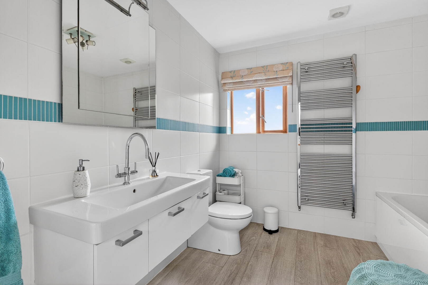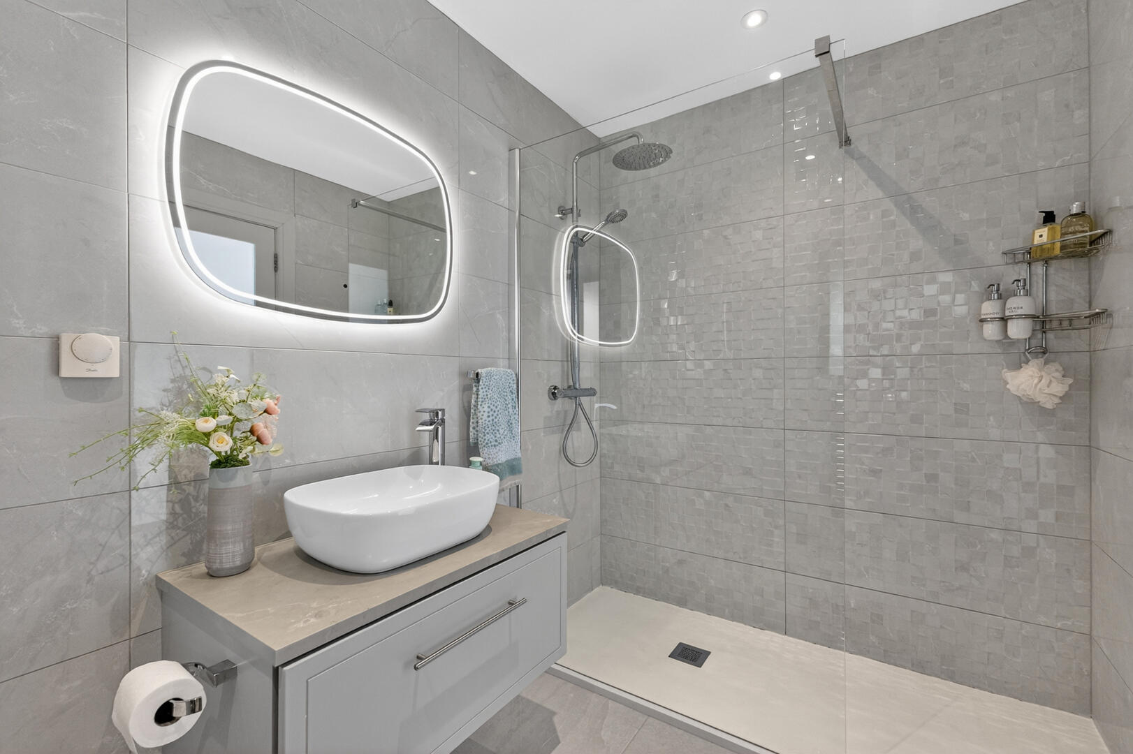 Four piece suite comprising panelled bath with mixer tap, separate built-in fully tiled shower cubicle, floating wash hand basin with mixer tap, storage beneath, low flush WC, laminate wood effect floor, fully tiled walls, views to Irish Sea, chrome heated towel rail, extractor fan.