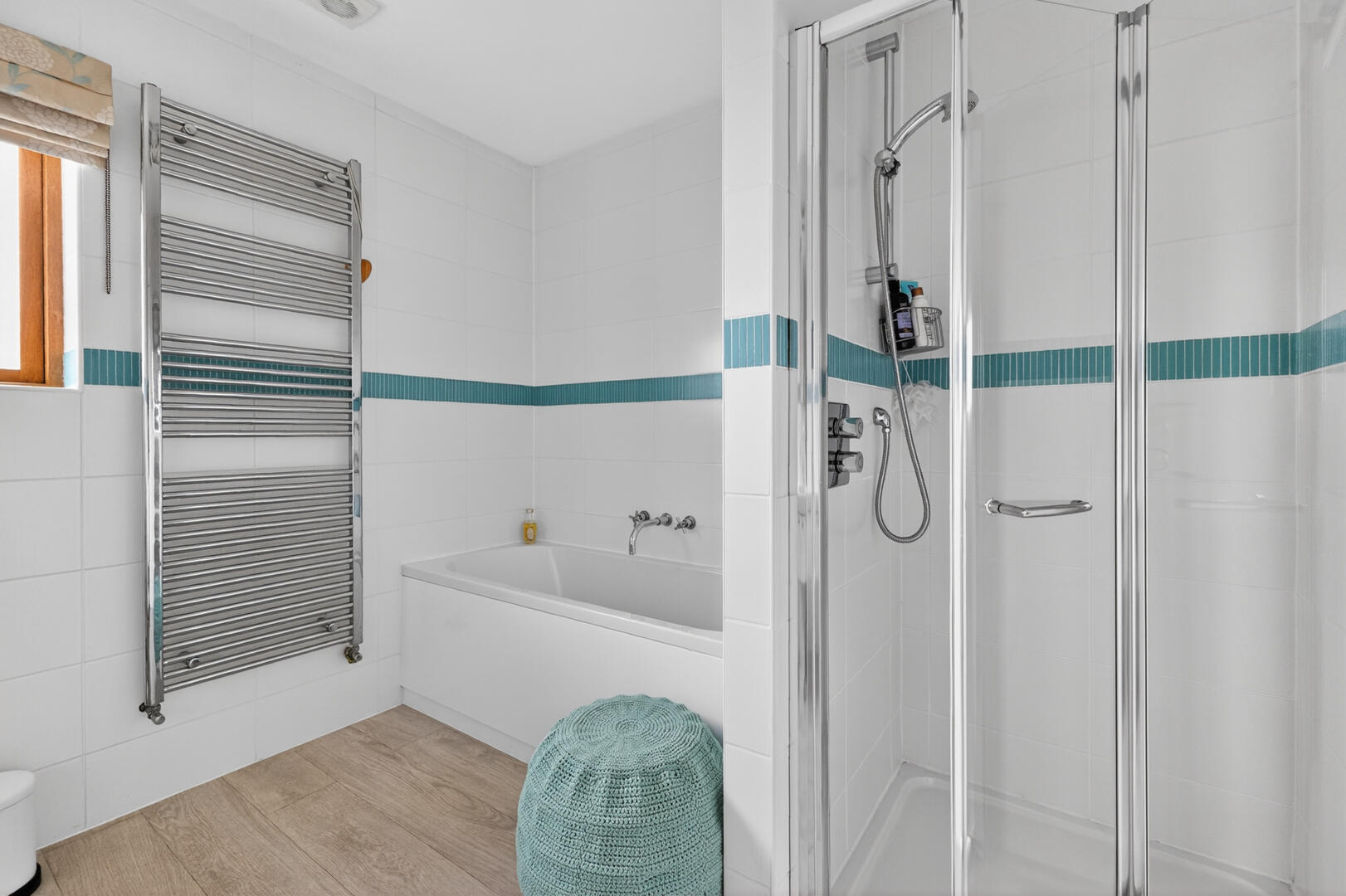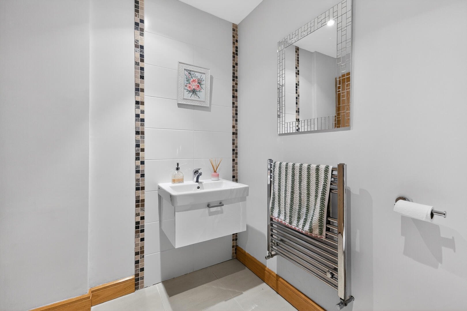 Three piece suite comprising walk-in shower cubicle, wash hand basin with mixer tap, storage below, low flush WC, built-in storage cupboard, fully tiled floor, part tiled walls, chrome heated towel rail, extractor fan.