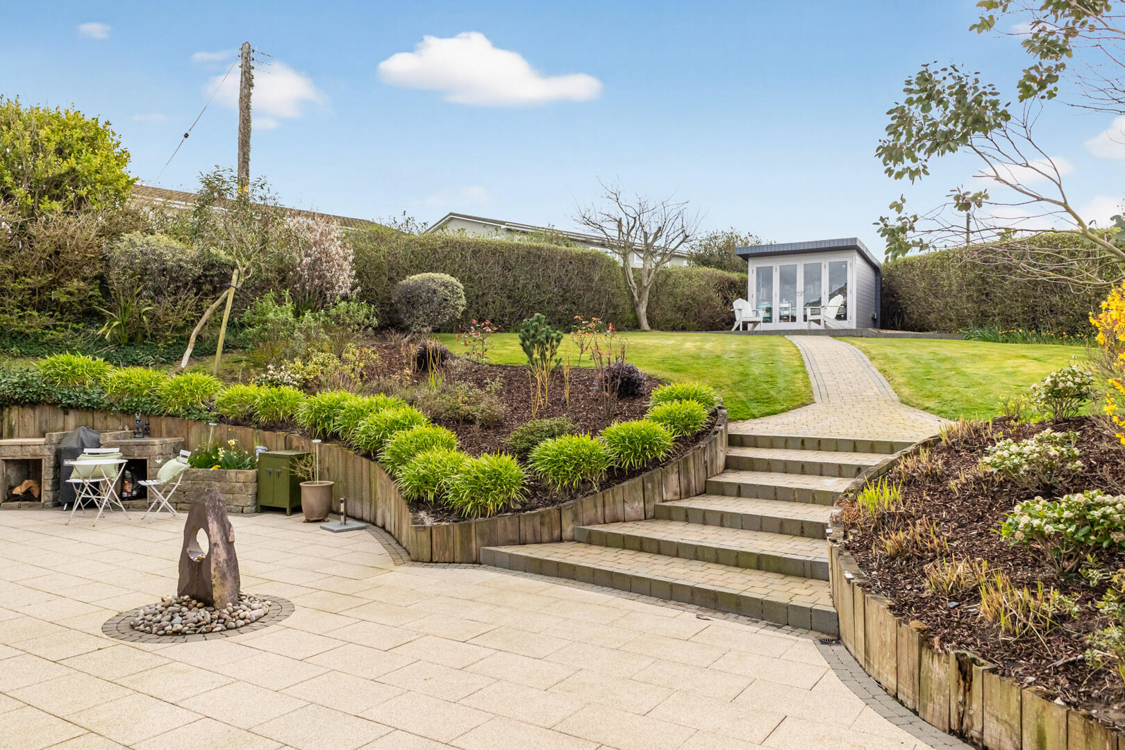 Outstanding Fully Enclosed Rear Garden in Lawns with Extensive Paved Patio Terrace Area, Built-in Barbecue Area, Flowerbeds in Plants and Shrubs and Summer House and Additional Upper Terrace