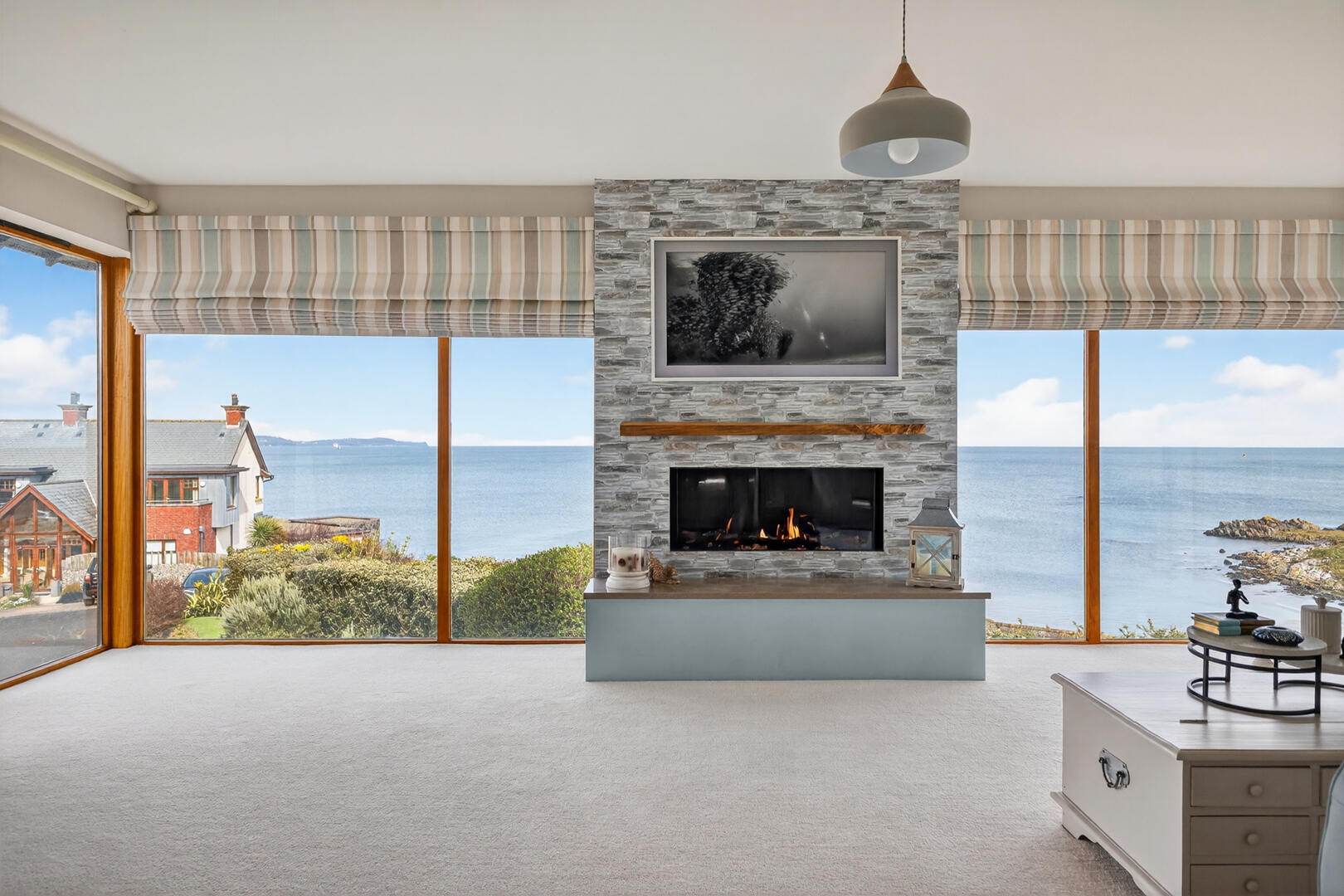 at widest points Stunning views of Irish Sea, Groomsport Harbour, Antrim coastline and beyond, feature raised Faber remote controlled gas fire, quartz hearth.