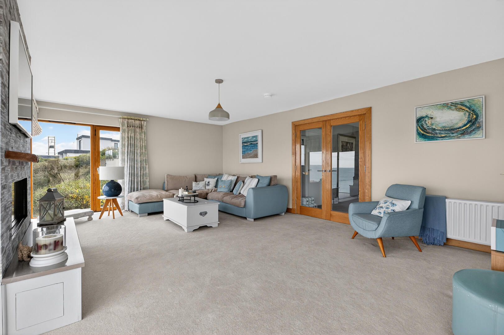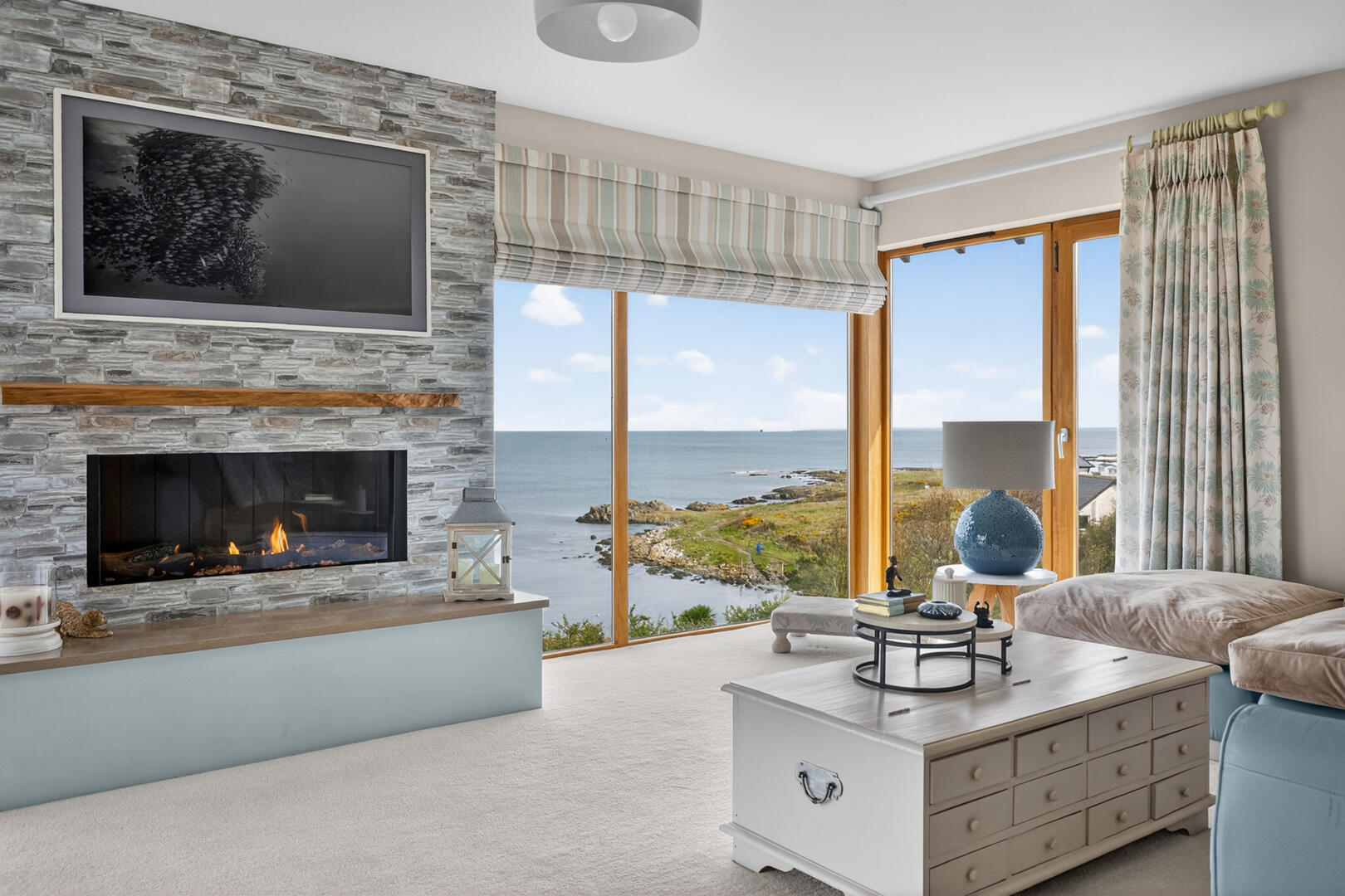 Upstairs is a stunning living room with spectacular views and a raised Faber remote-controlled gas fire, along with three additional bedrooms (one with sea views and balcony) and a bathroom with bath and separate shower.