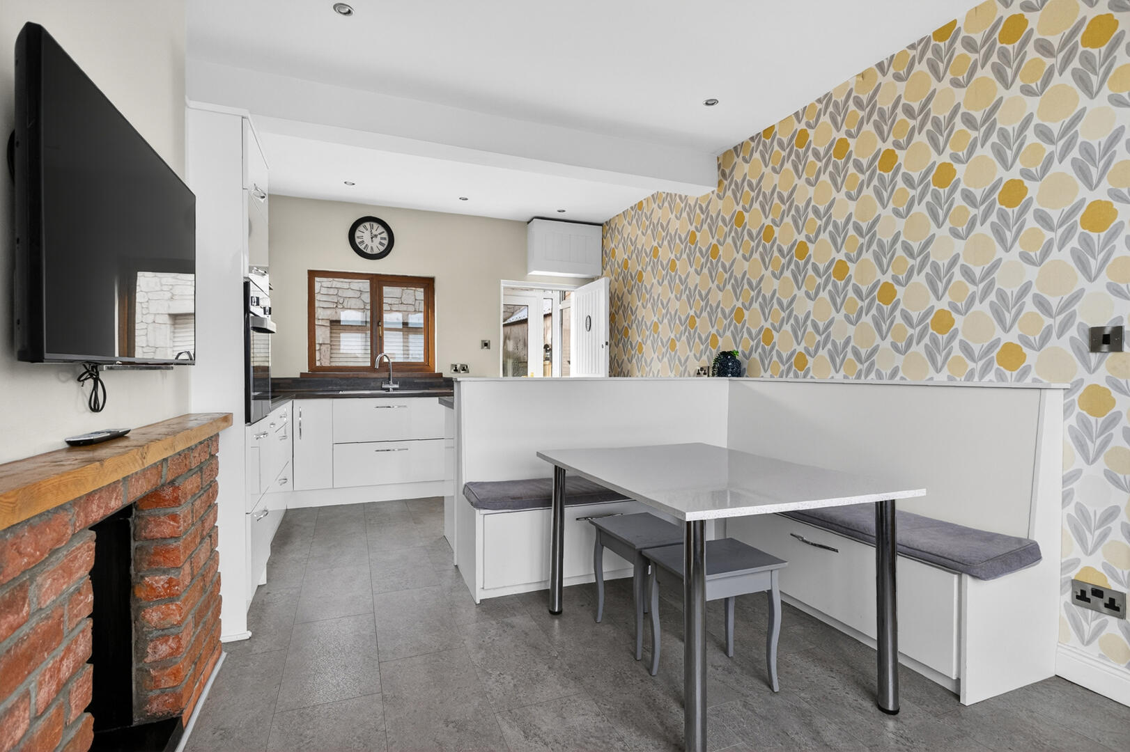 Range of high and low level high gloss units, laminate work surfaces, Franke one and a half bowl single drainer stainless steel sink unit with mixer tap, integrated four ring hob, splashback, extractor fan above, integrated oven, integrated dishwasher, recess for fridge freezer, brick fireplace with potential for stove or fire subject to necessary approvals, laminate tile effect floor, concealed strip lighting, built-in seating with storage beneath, sea views.