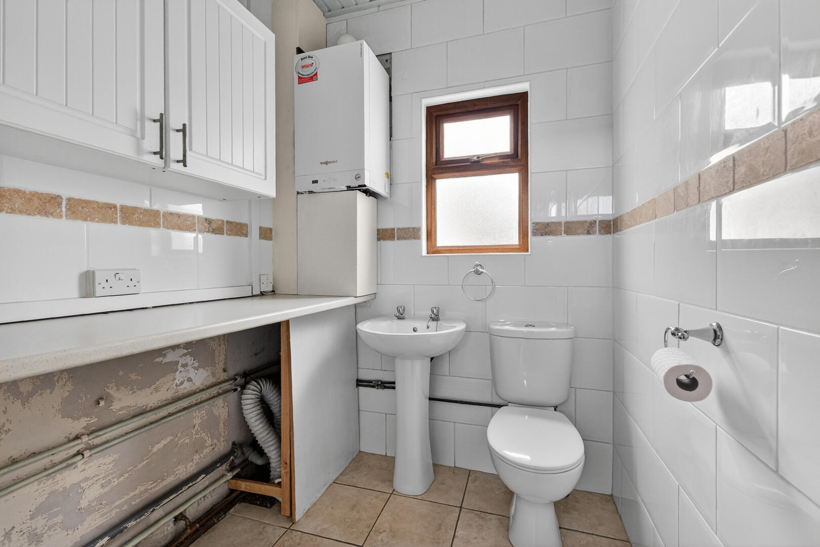 Two piece suite comprising low flush WC, pedestal wash hand basin, plumbed for washing machine, storage cupboards, granite effect work surfaces, gas fired boiler, fully tiled floor, part tiled walls.
