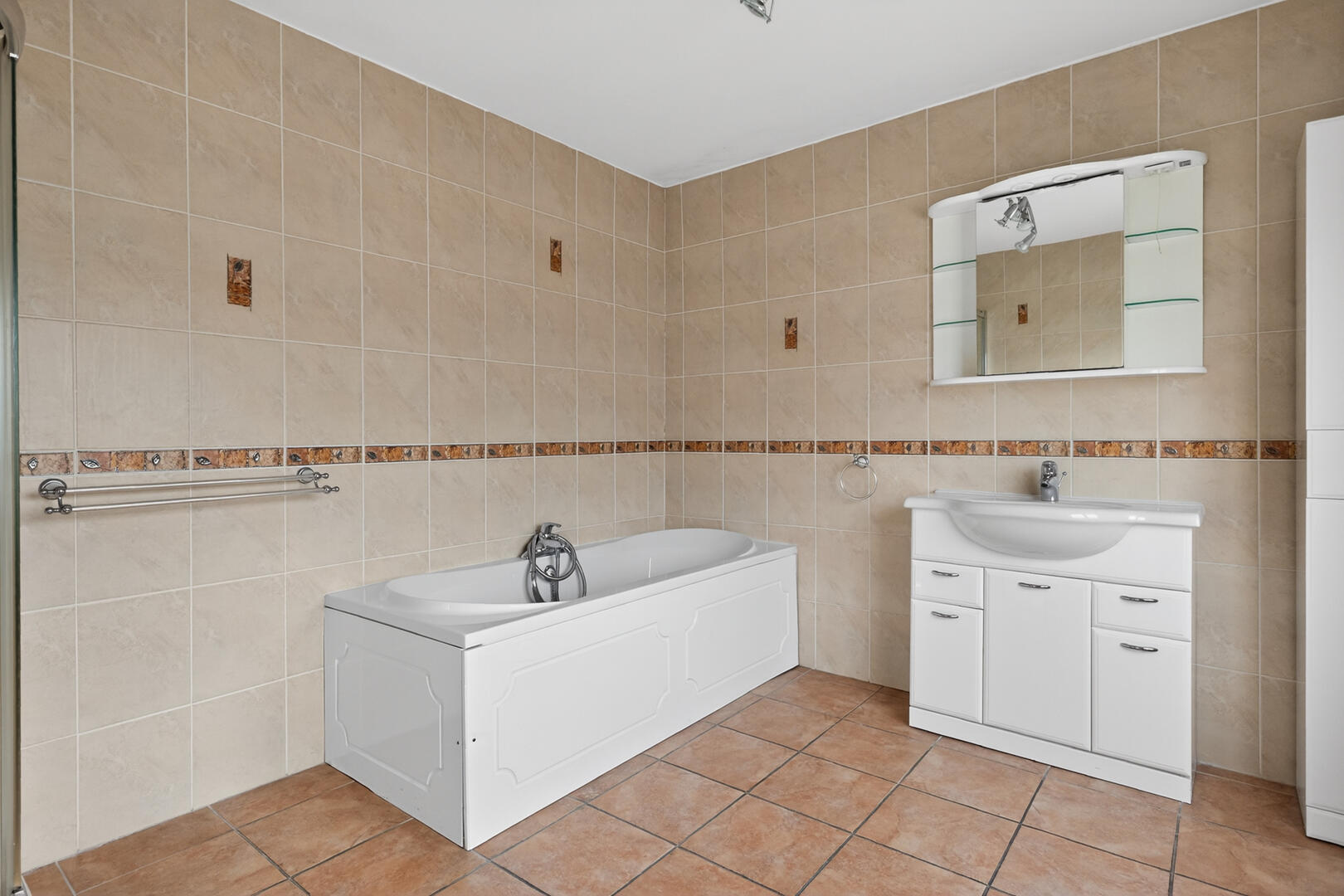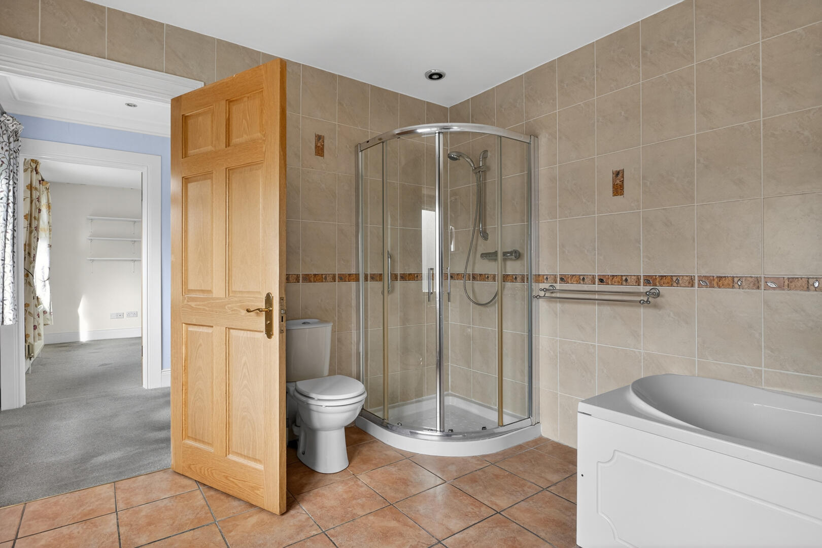 Four piece suite comprising panelled bath with mixer tap and hand shower, separate built-in fully tiled shower cubicle, wash hand basin with mixer tap, storage beneath, low flush WC, fully tiled floor, fully tiled walls.