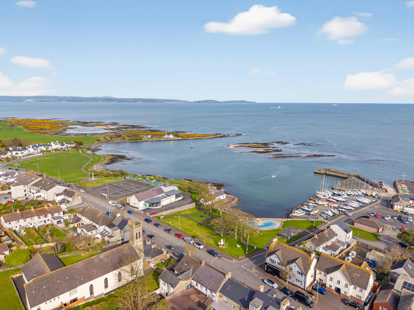 Groomsport is a picturesque, historic seaside village located on the shores of Belfast Lough. Famous for its ancient harbour-reputed to have Viking origins-the village offers a charming mix of coastal scenery and sandy beaches, including the iconic Cockle Row Cottages.