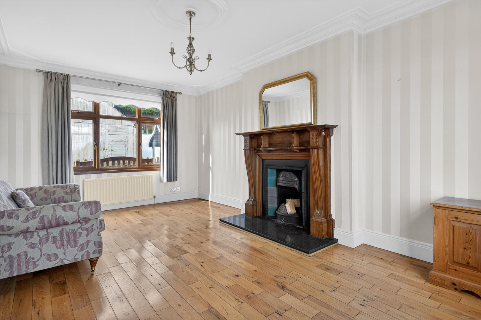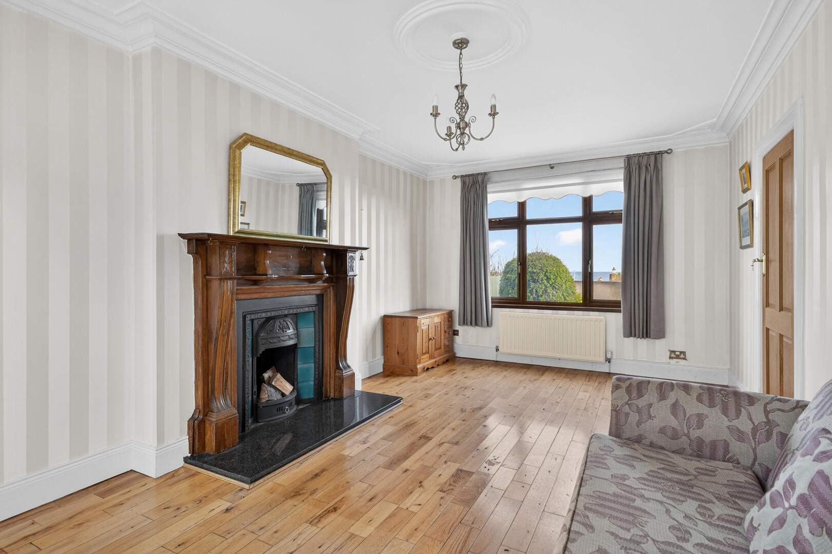Sea views, solid oak wooden floor, attractive carved wooden fireplace surround, cast iron tiled inset, granite hearth, open fire, cornice ceiling, ceiling rose.
