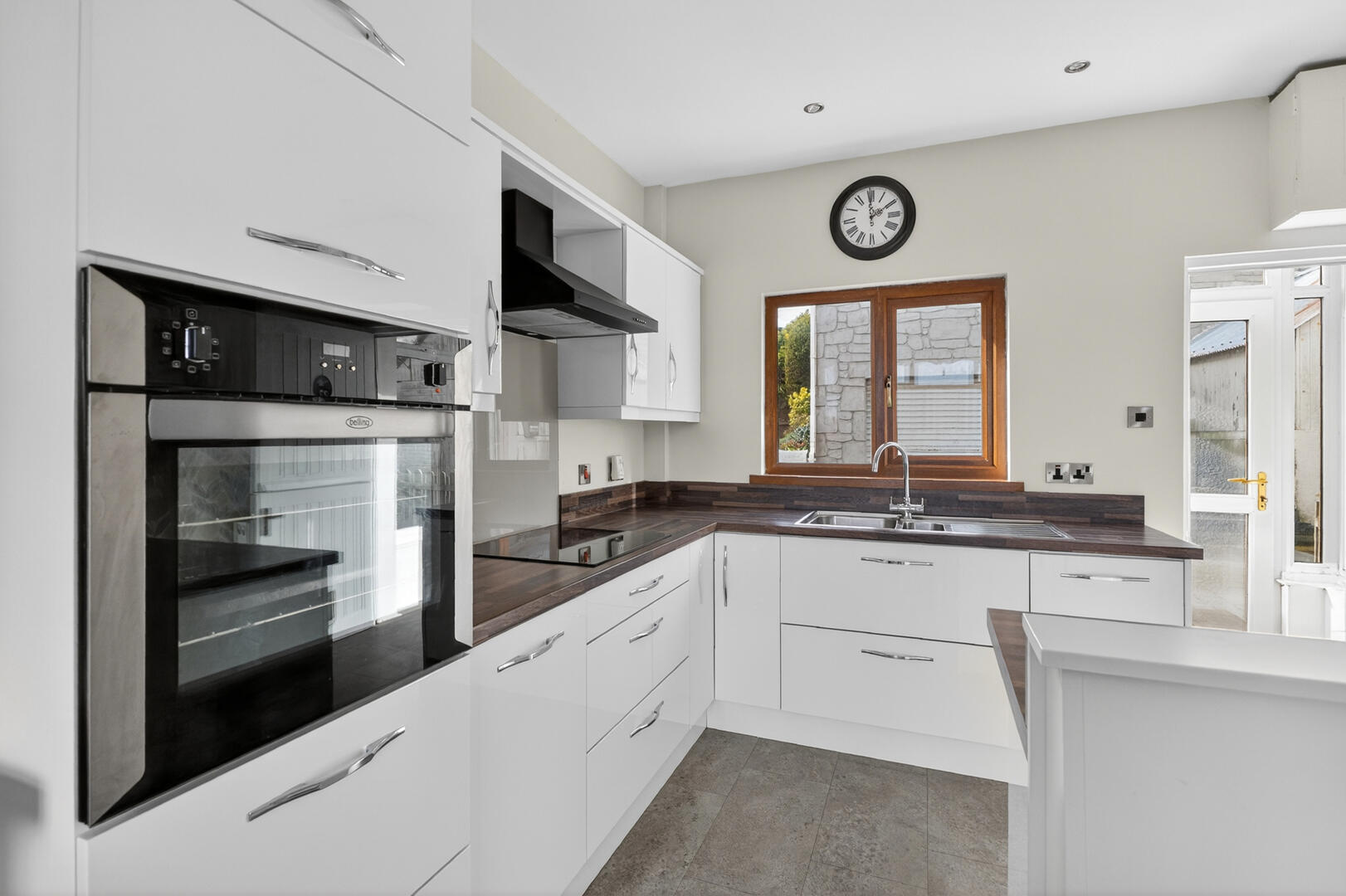 Laminate tile effect floor, uPVC double glazed door to outside.