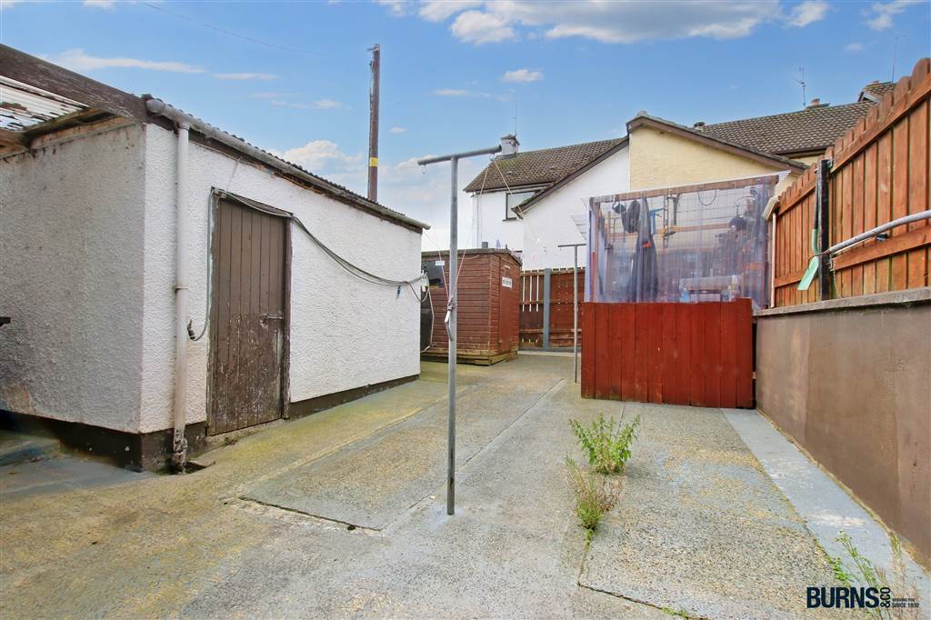 stoned area to front; fully enclosed rear yard with outbuilding, wooden shed and covered lean-to, fixed washing line and outside tap; side alleyway (shared with adjacent dwelling).