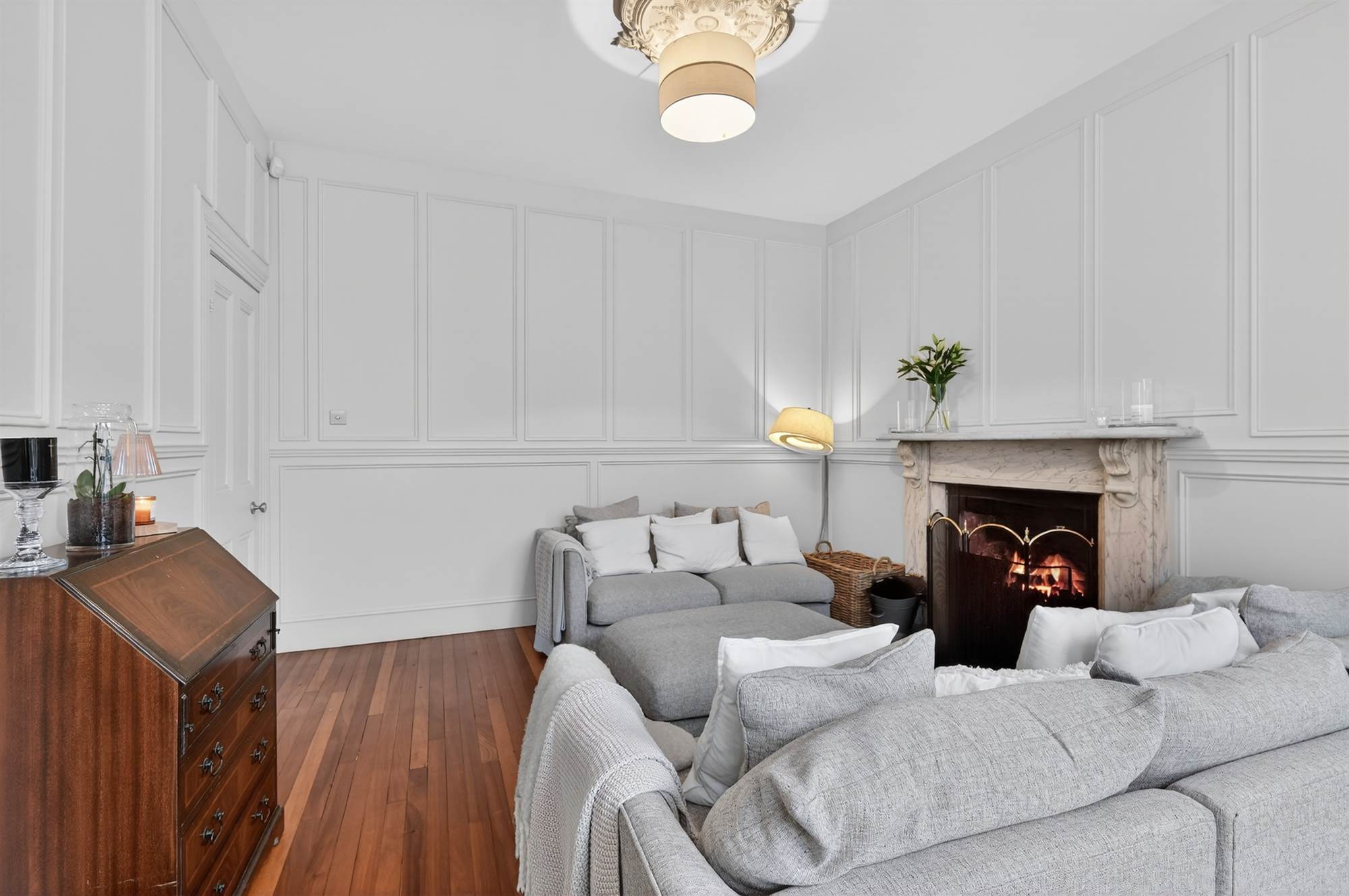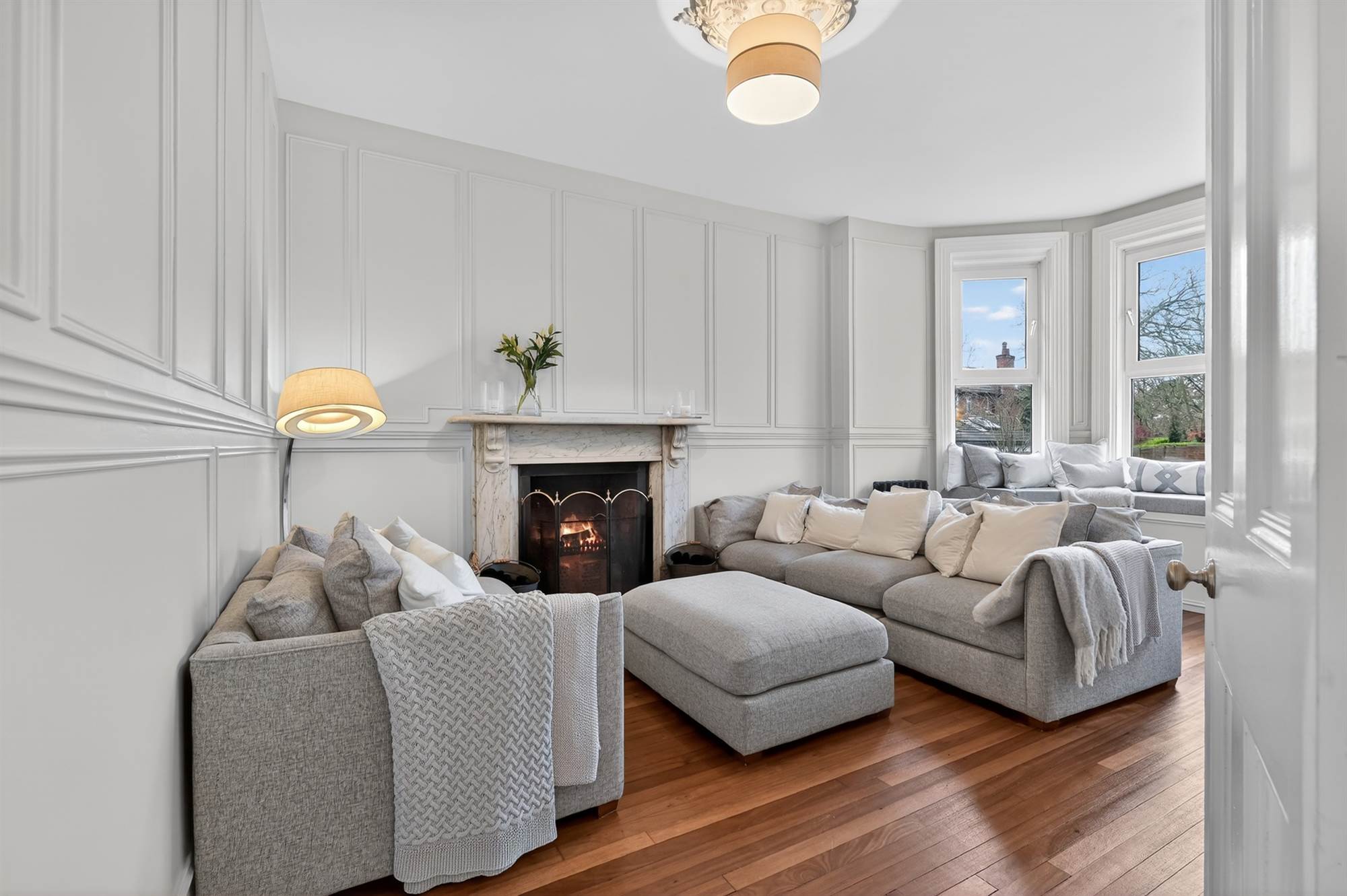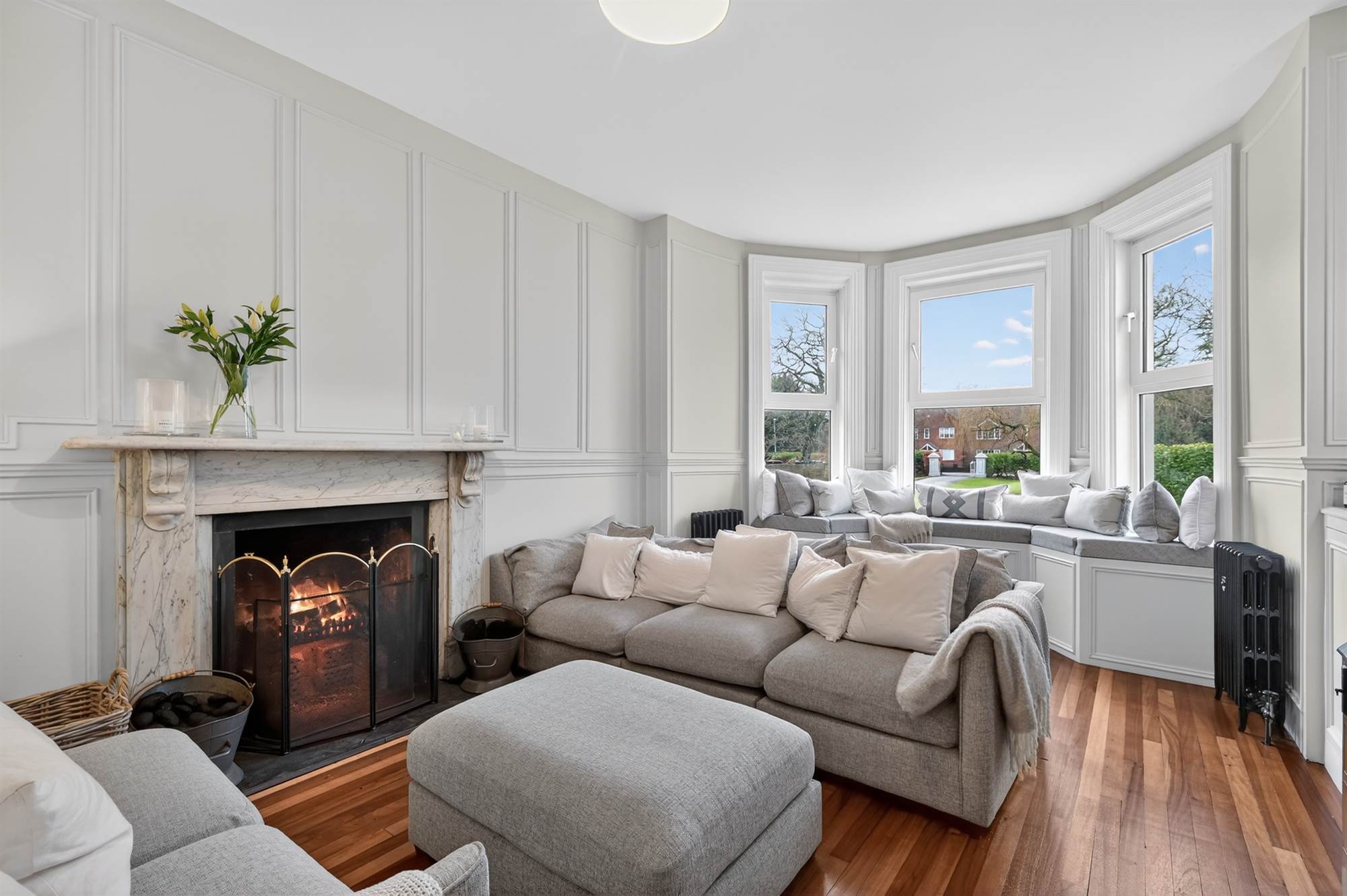 Feature Victorian marble fireplace and slate hearth with open fire, built-in bay window seat with storage, panelled walls, oak wood strip flooring, decorative ceiling rose.