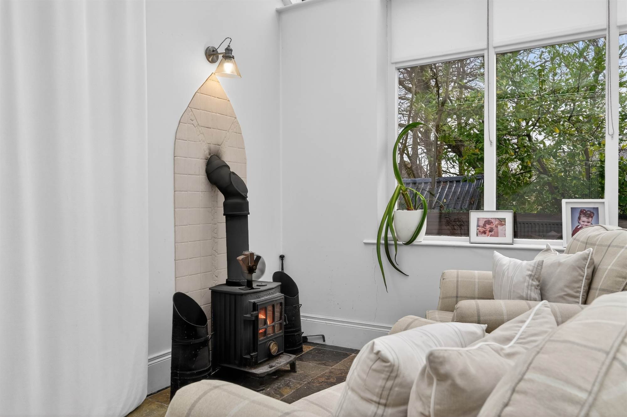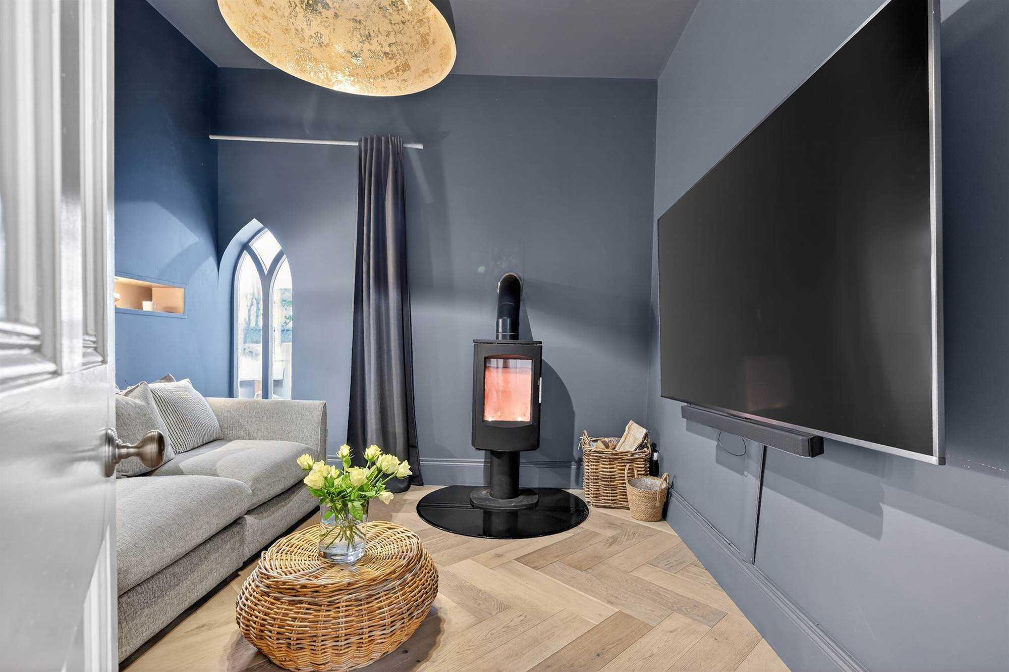 Engineered herringbone oak wood floor, wood burning stove, feature gothic window, recessed shelf with light.