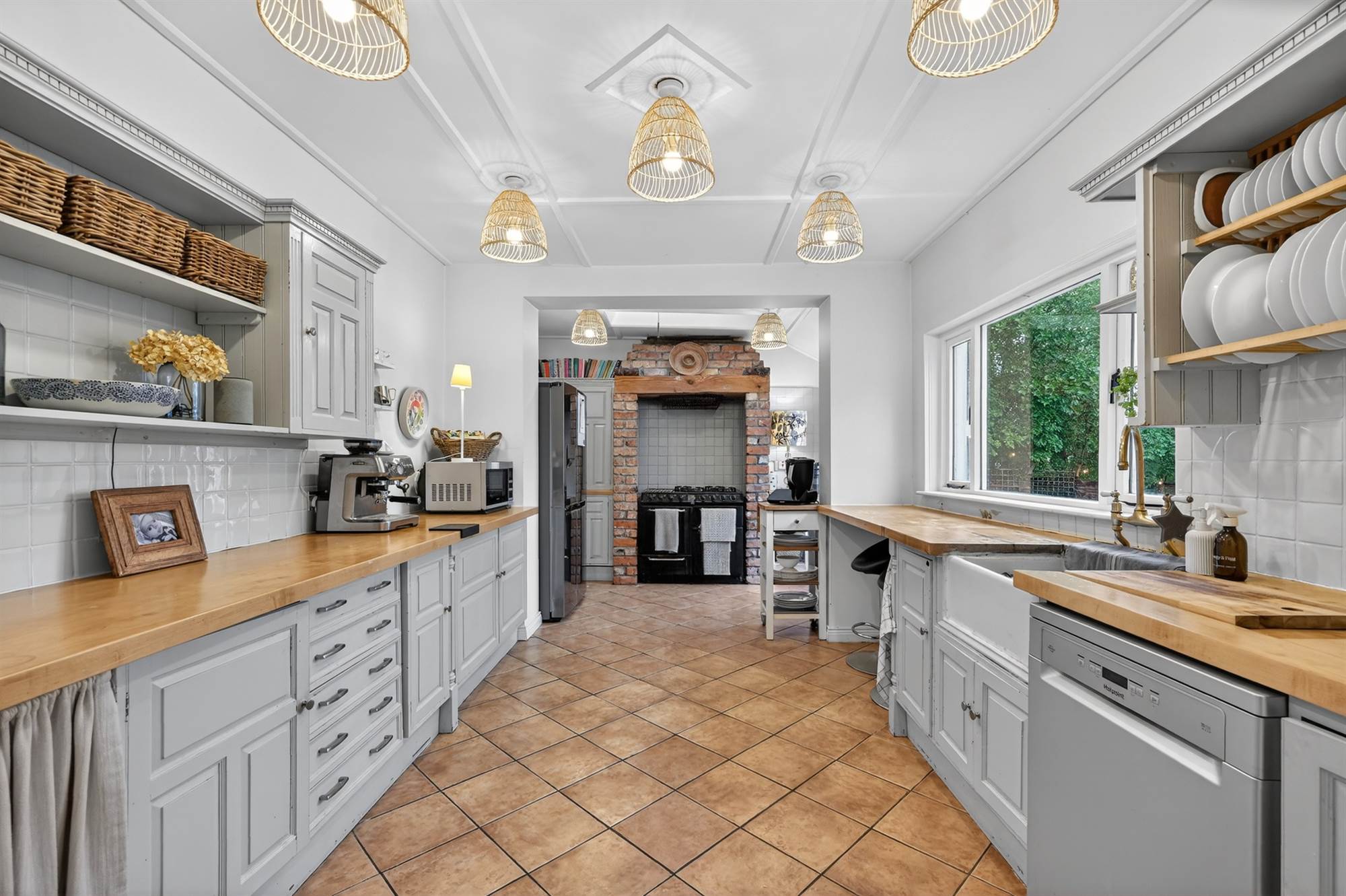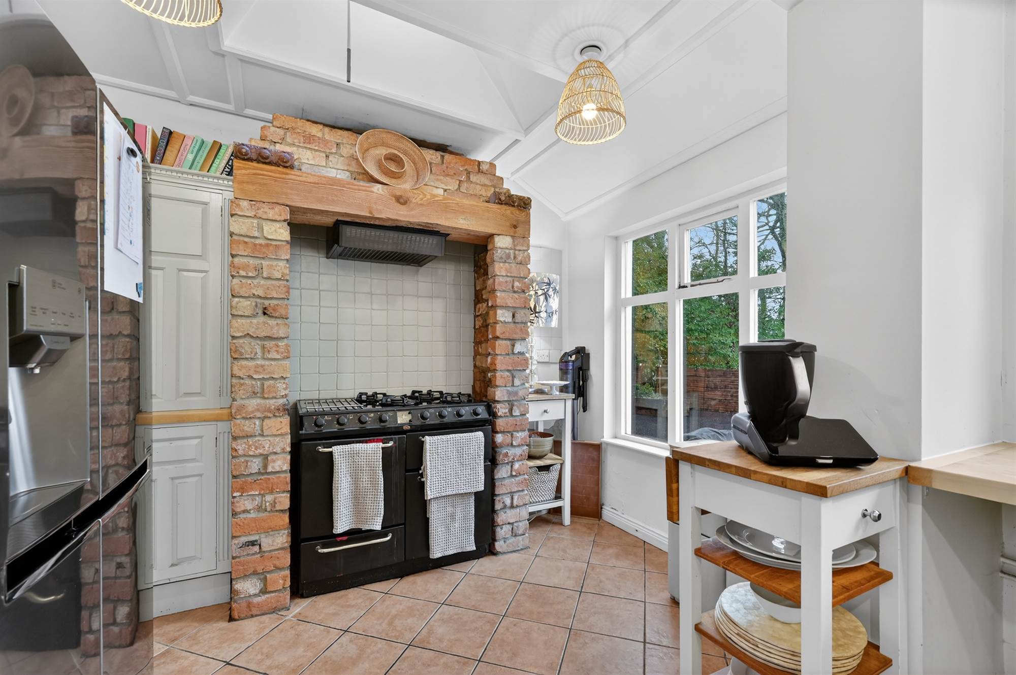 Painted oak Shaker style kitchen with range of high and low level units, wood block worktops, Belfast sink unit with mixer tap, cooker recess with rustic brick surround and timber mantle, range cooker with double oven, plate warmer and grill, four ring gas hob plus ceramic hob, extractor fan, space for dishwasher, plumbed for washing machine, ceramic tiled floor.