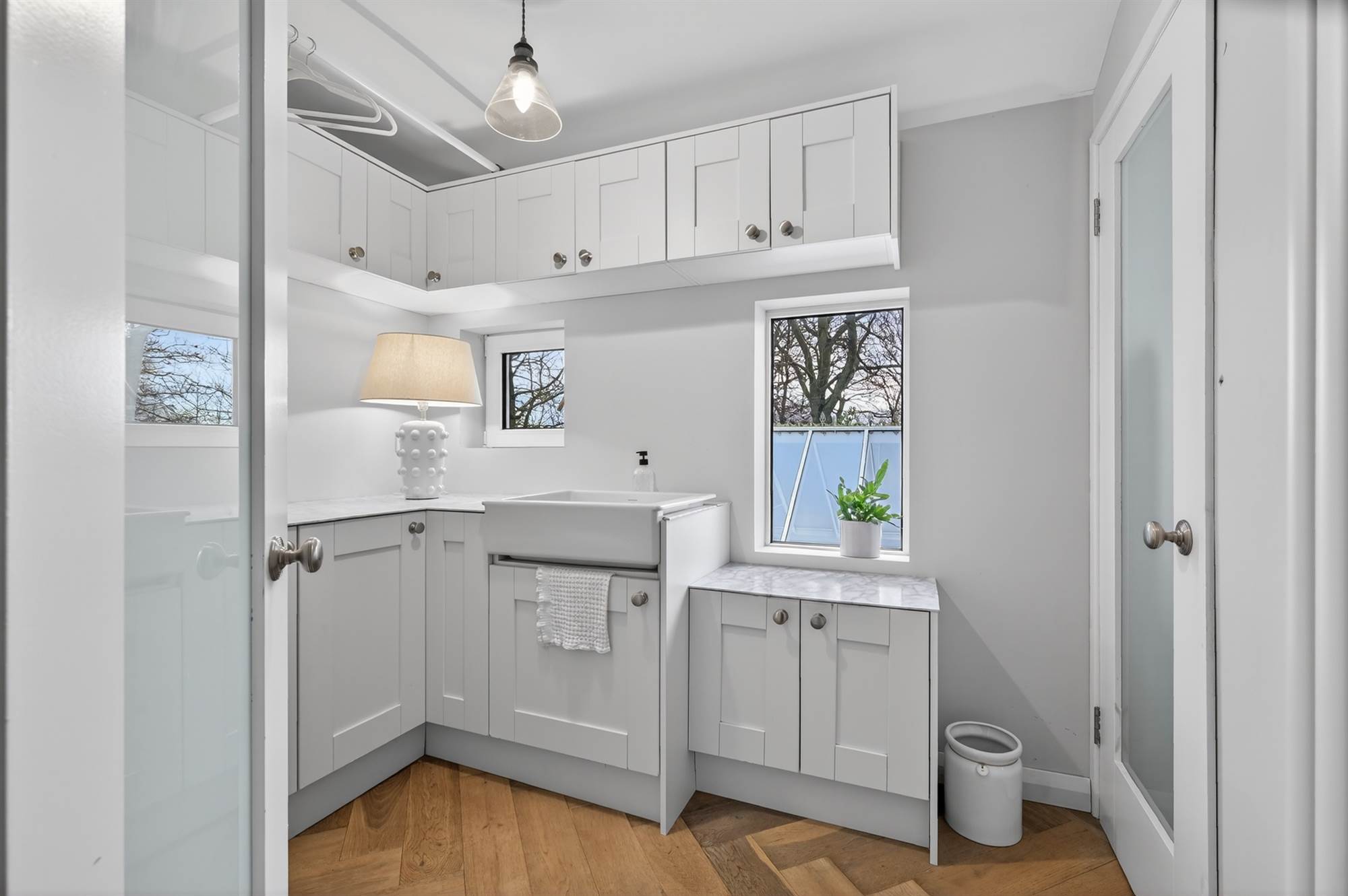 Range of high and low level units, Belfast sink, window, engineered herringone oak wood floor, access to roofspace. Cupboard with pressurised hot water system.