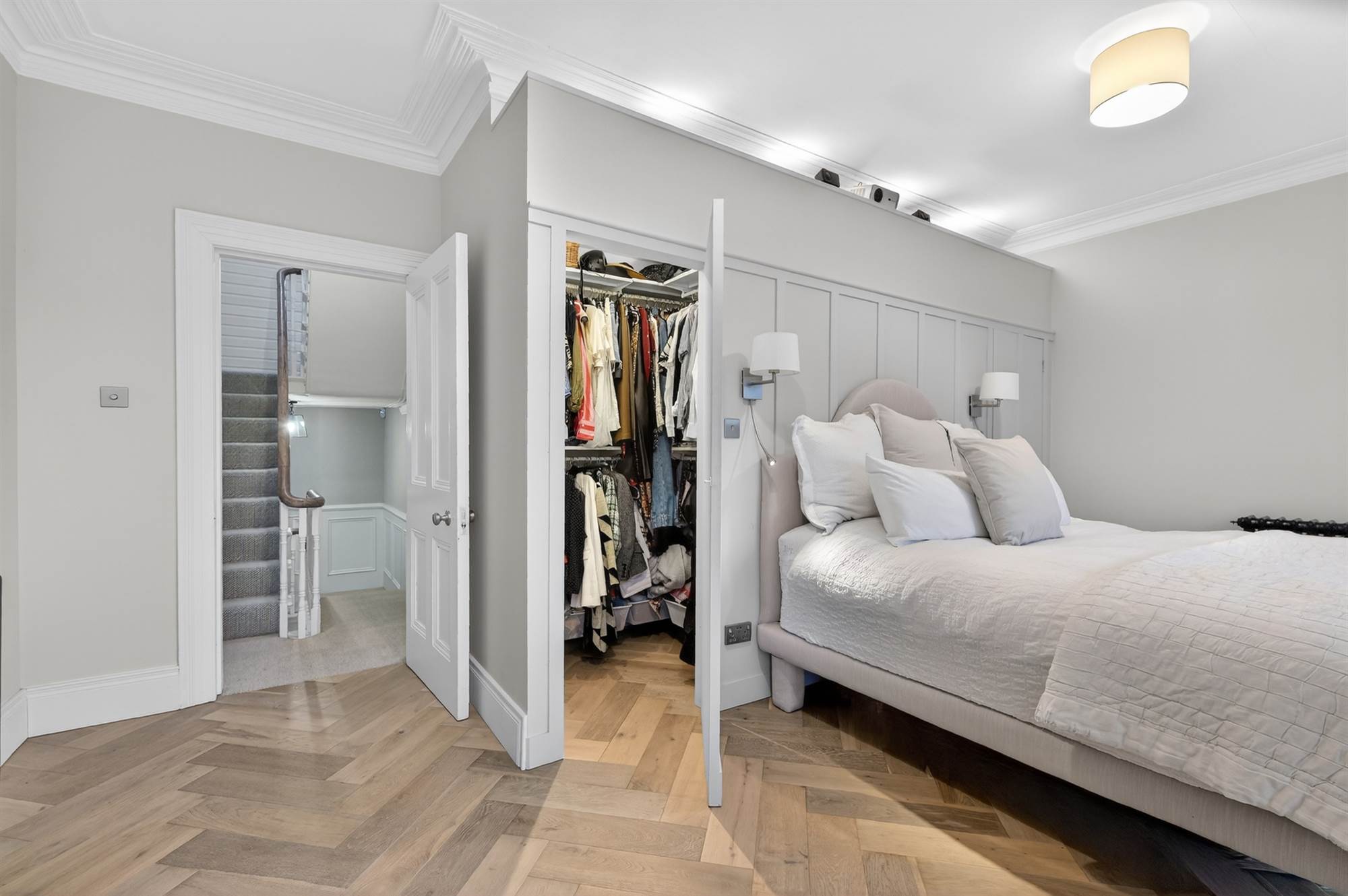 Engineered herringbone oak wood floor, walk-in wardrobe.