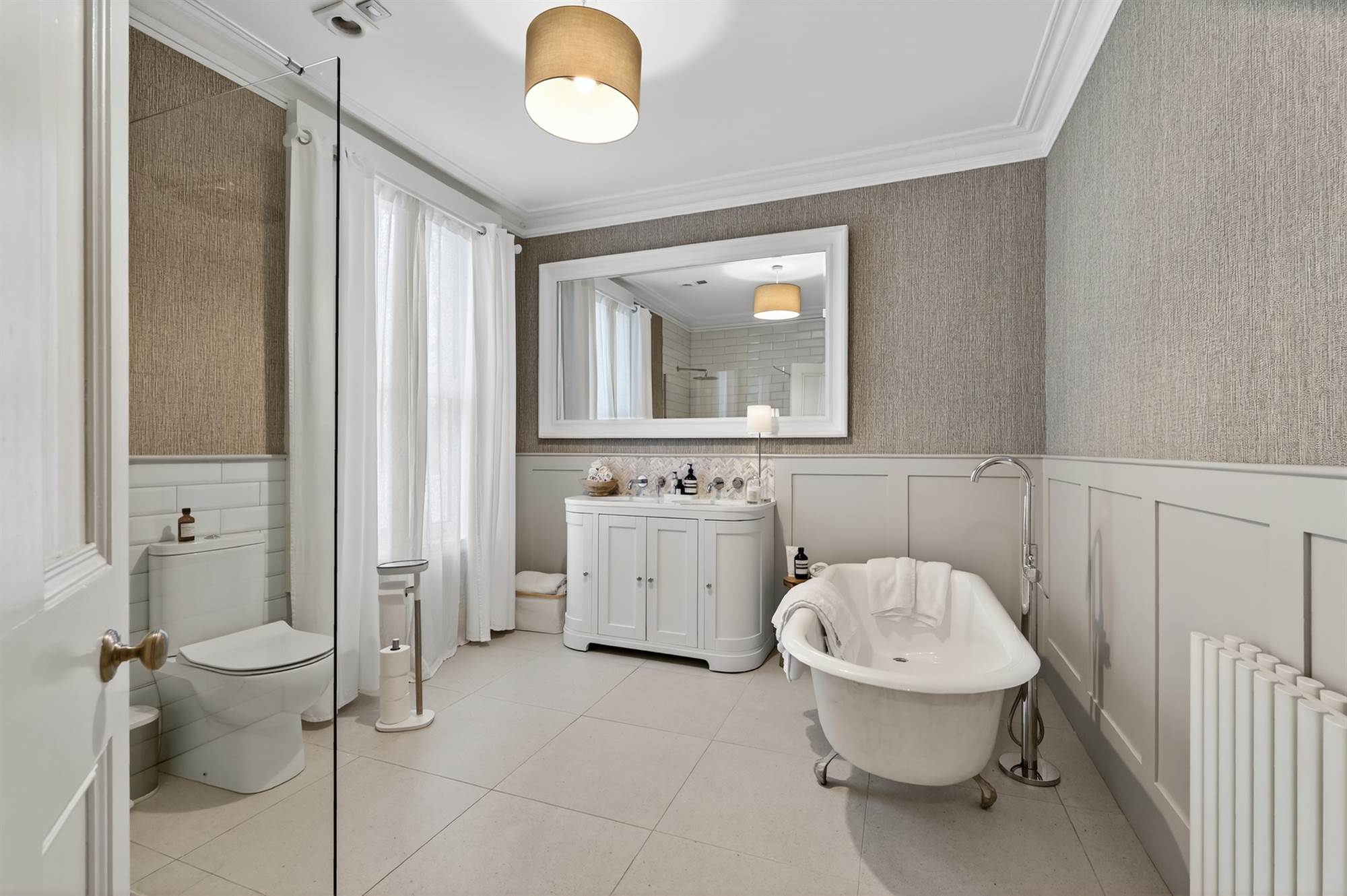 Four piece white suite comprising free-standing bath with ball and claw feet and free-standing mixer tap, built-in panelled shower cubicle with rainfall drencher shower head, shelved recess, twin wash hand basins with mixer tap, Nepture marble splashback and low level cupboard.
