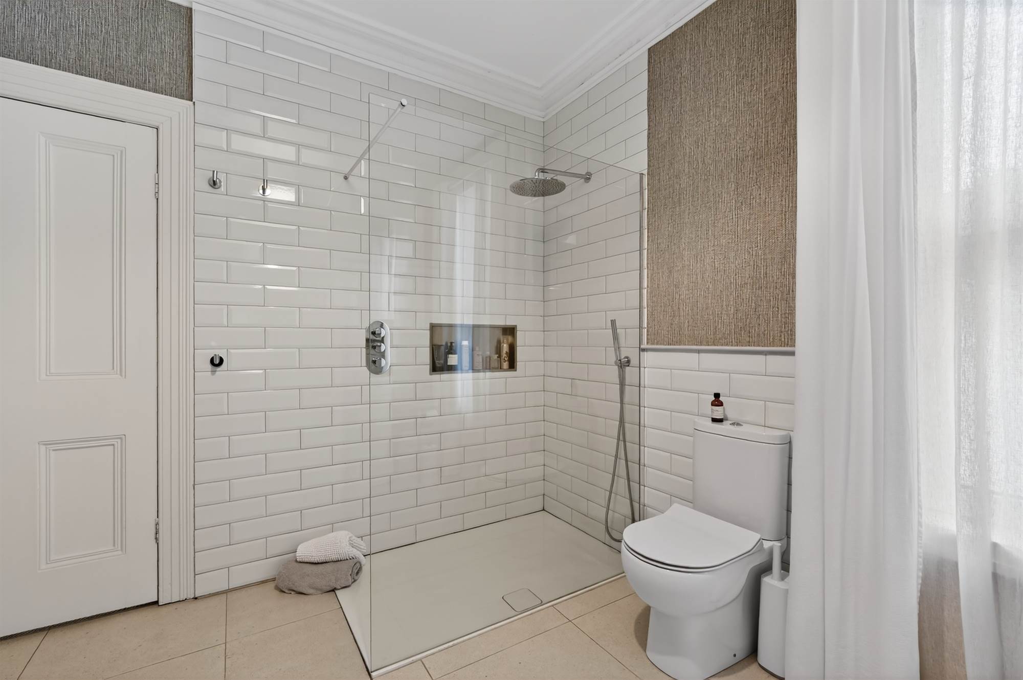 Fully tiled built-in shower cubicle with mains shower and telephone attachment, wash hand basin with mixer tap and low level cupboard, low flush wc, shaver point.