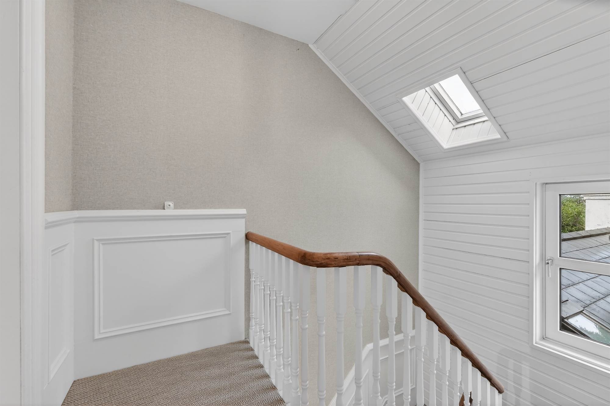 Wood panelling, dado rail, cornice ceiling, ceiling rose and corbels, storage alcove understairs.