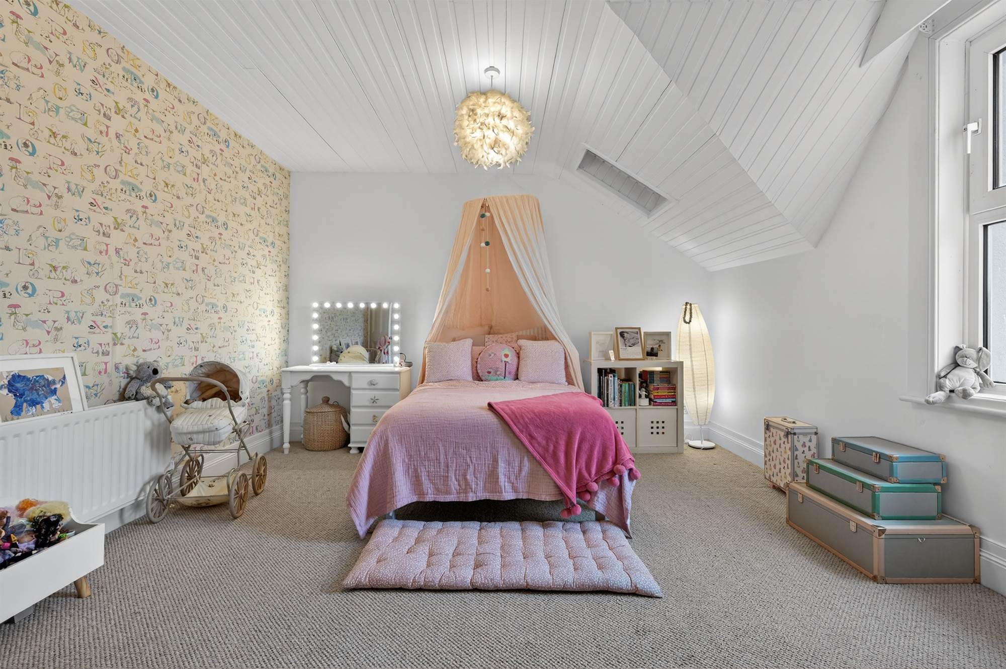 Painted tongue and groove ceiling, wall to wall range of built-in wardrobes with louvered doors, window and Velux window, access to roofspace.