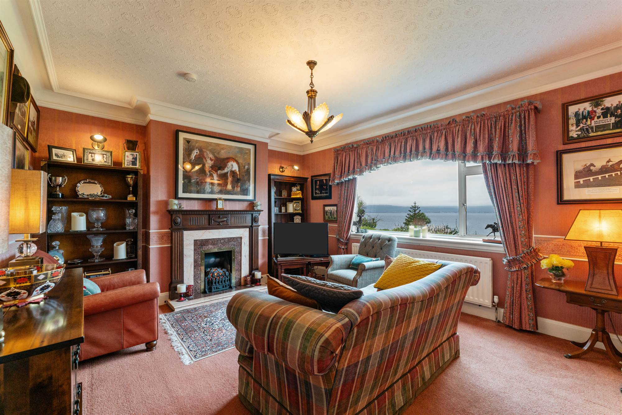 Hardwood fire surround with marble inset, gas fire and marble hearth, large picture window with sea views, wall light wiring, walk in drinks cupboard with shelving.