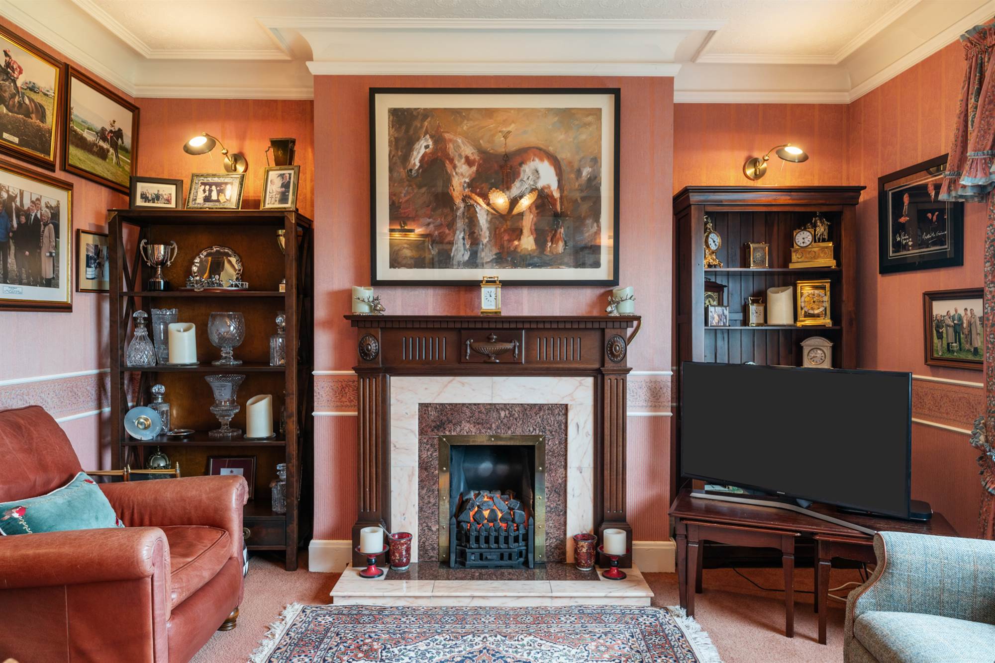 Living room with gas fire, and butlers pantry