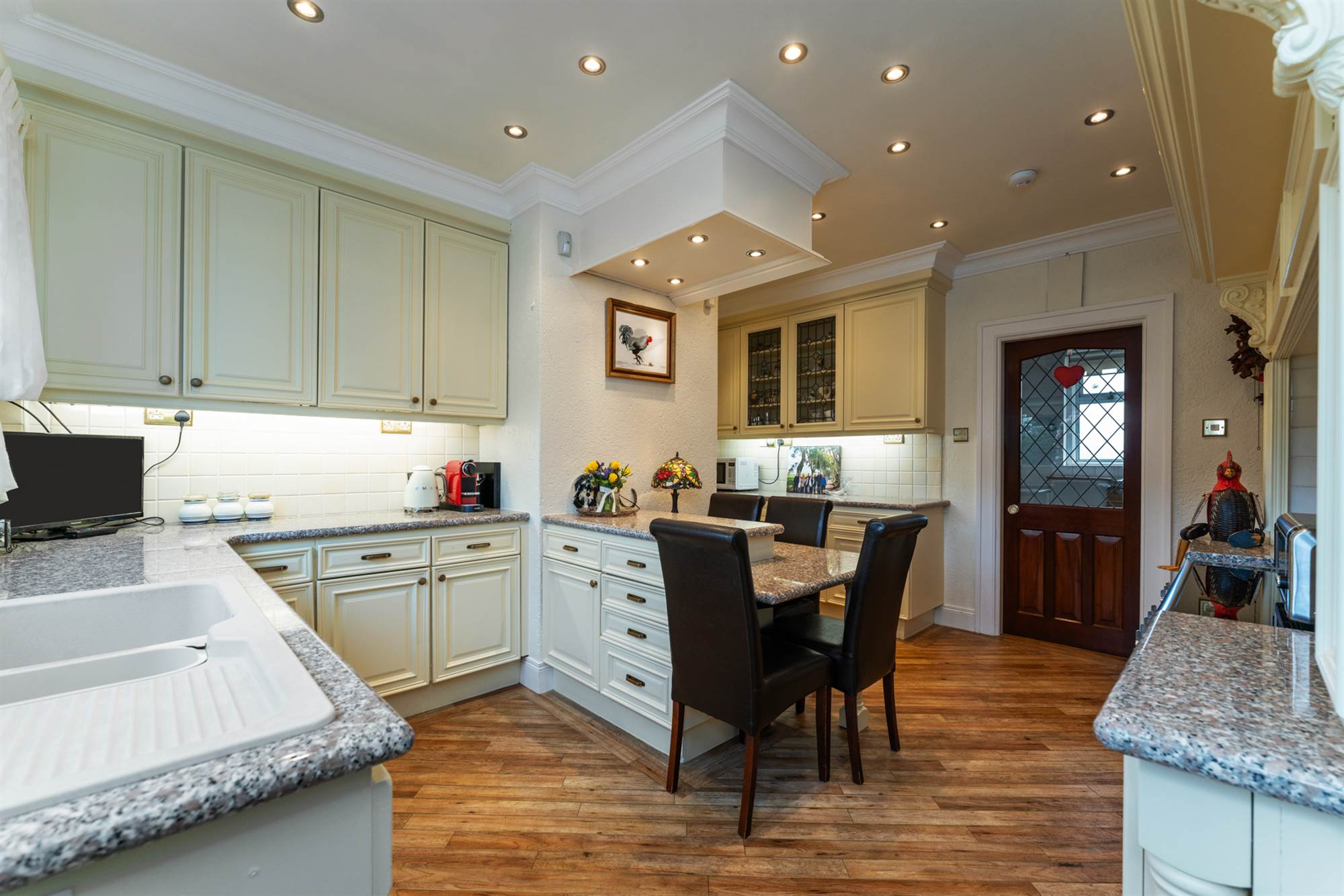 High and low level units with marble worktops, 1.5 drainer sink unit with mixer taps, access for electric range with tiled splashback with concealed extractor canopy, island with casual dining, tiled floor, recessed lighting, access to rear Entrance Hall.