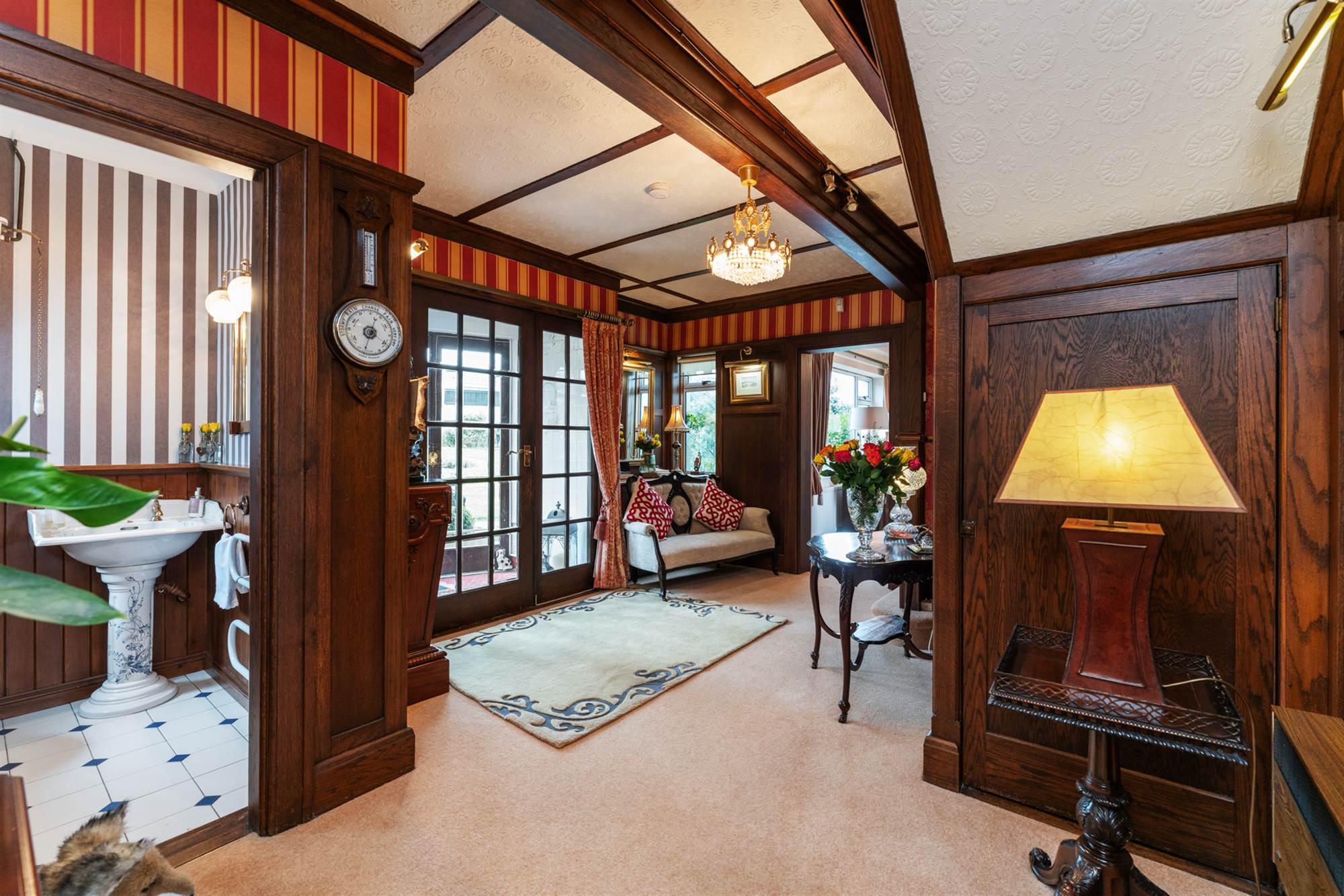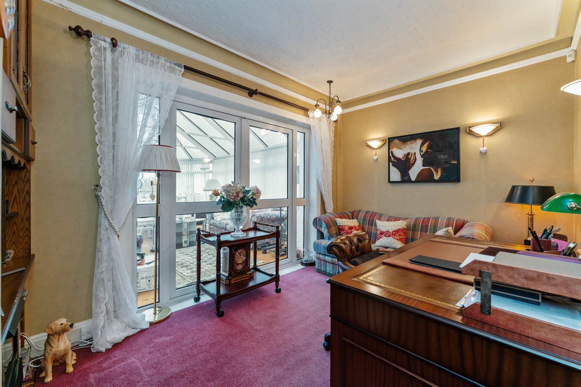 Wall light wiring, double opening glazed doors to Conservatory.