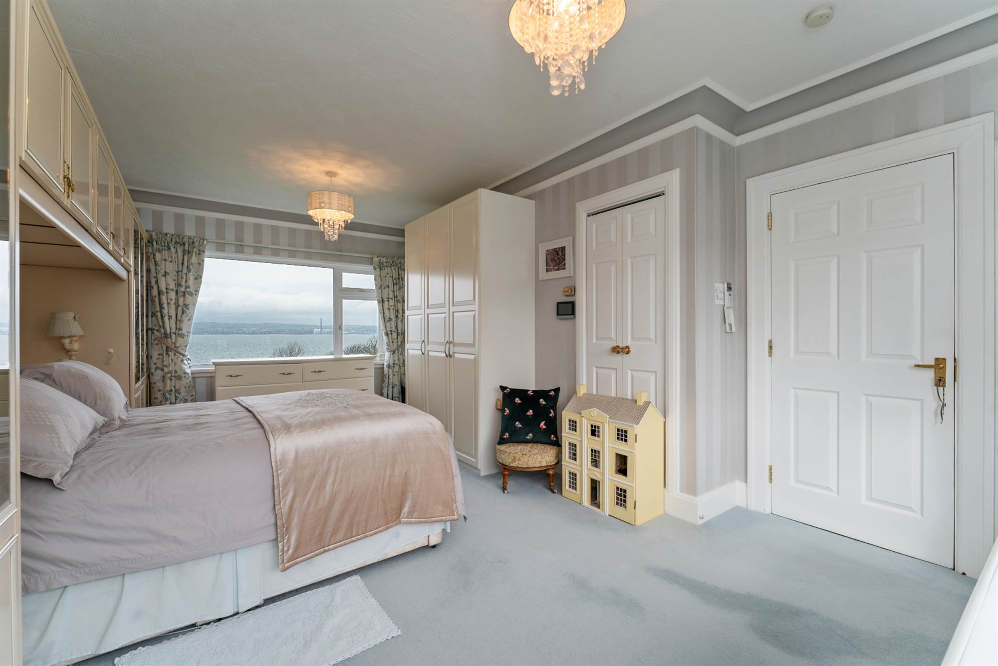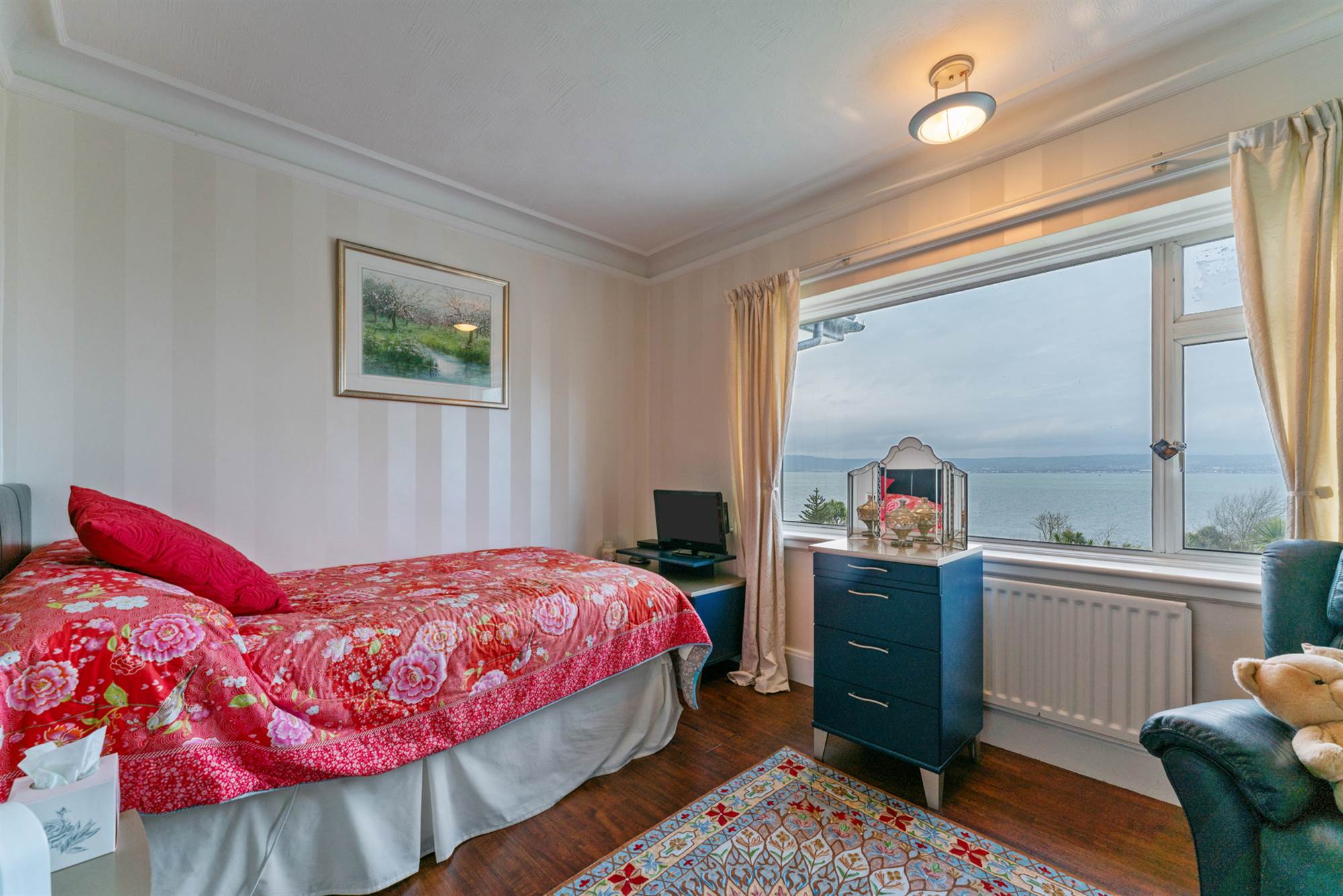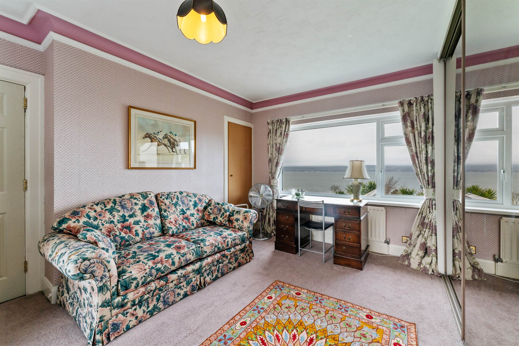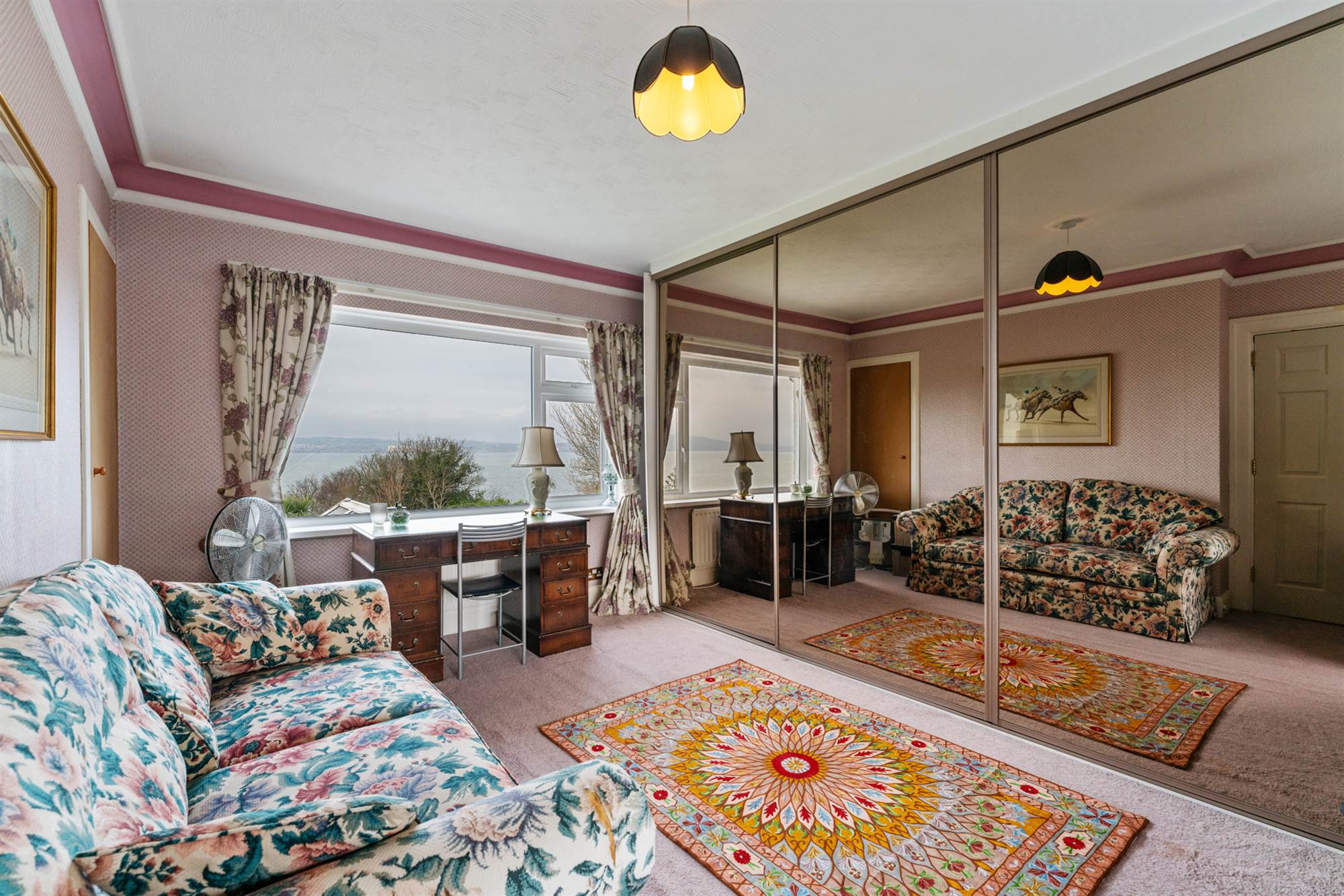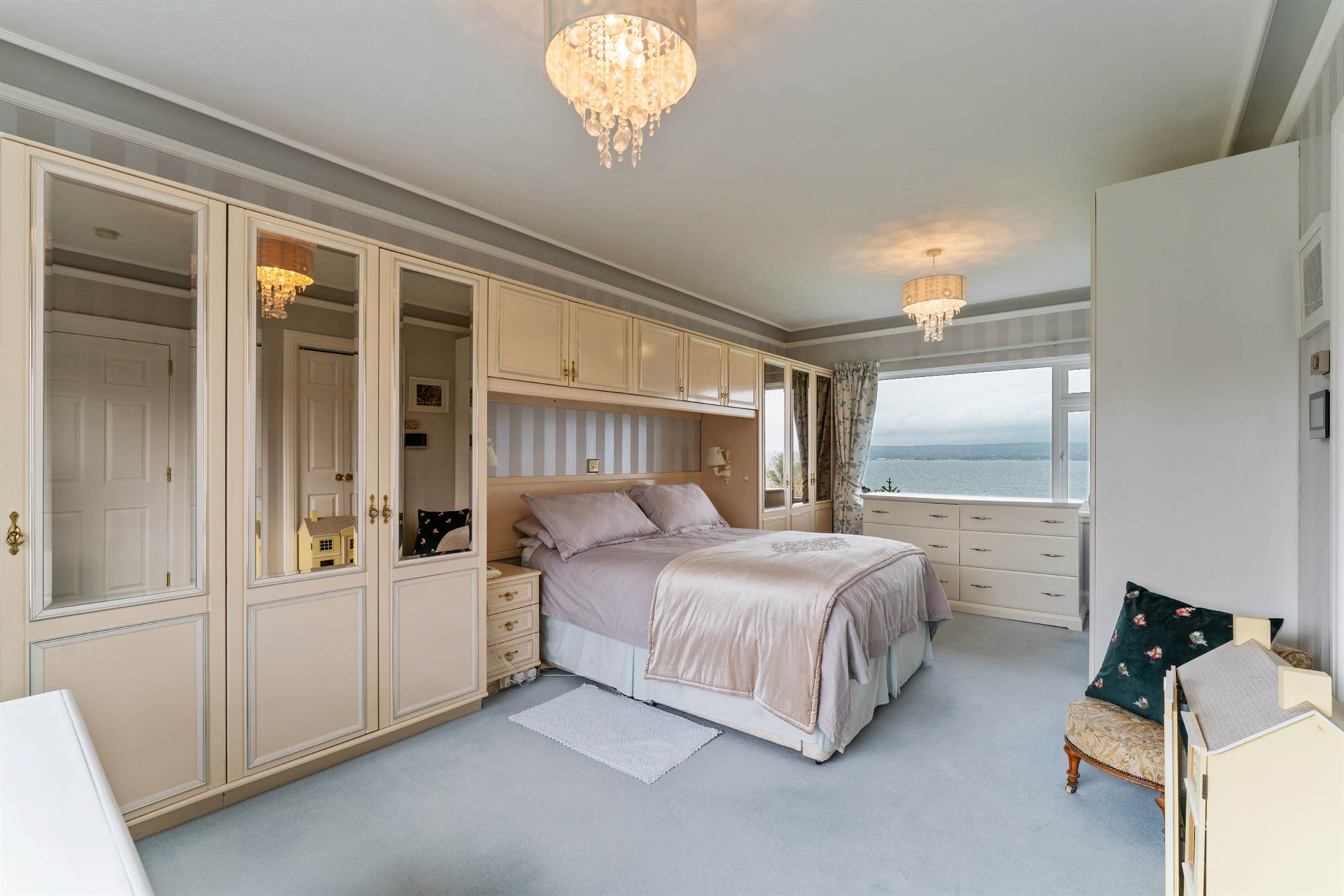 Built in mirrored sliding wardrobes. Large picture window with sea views.