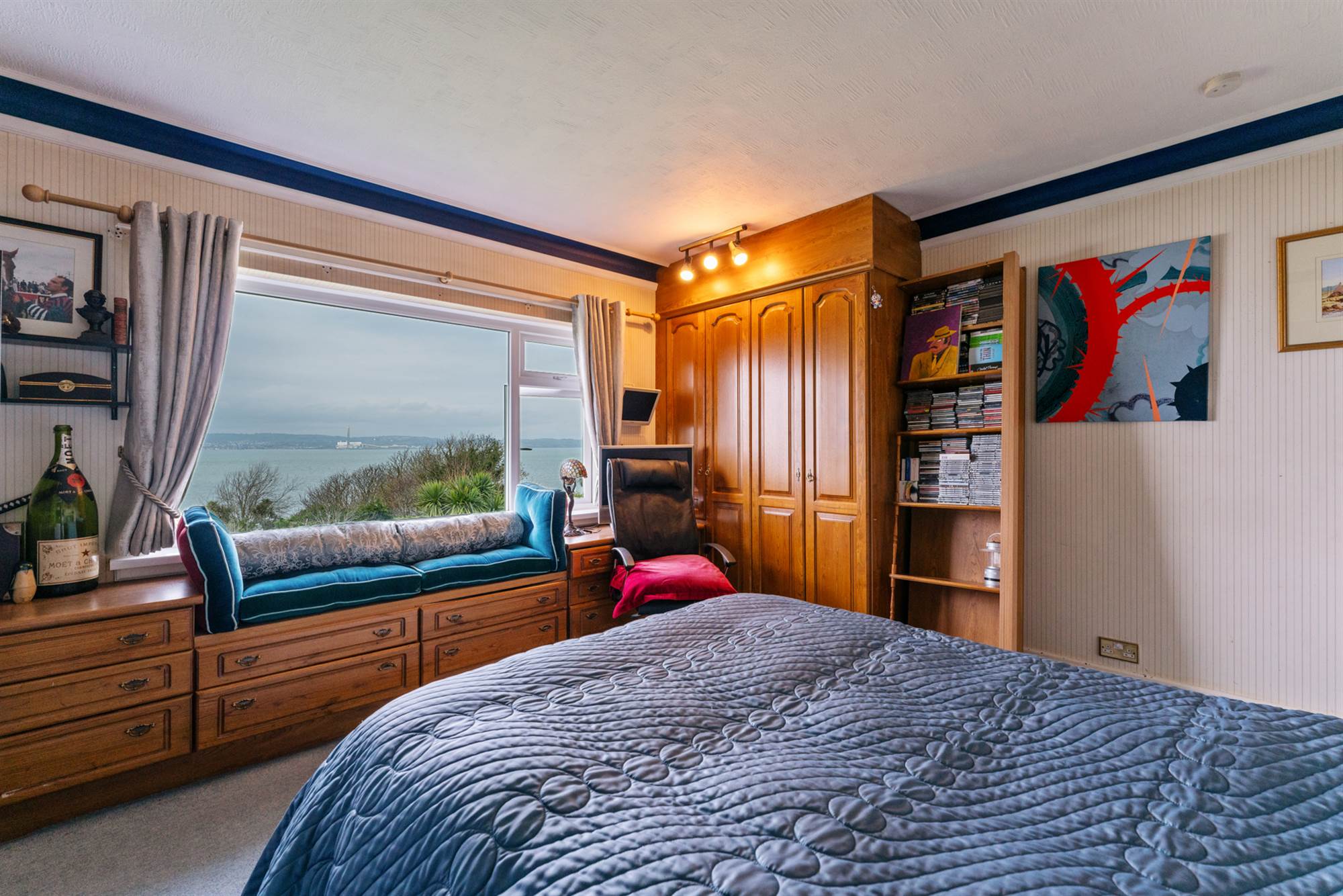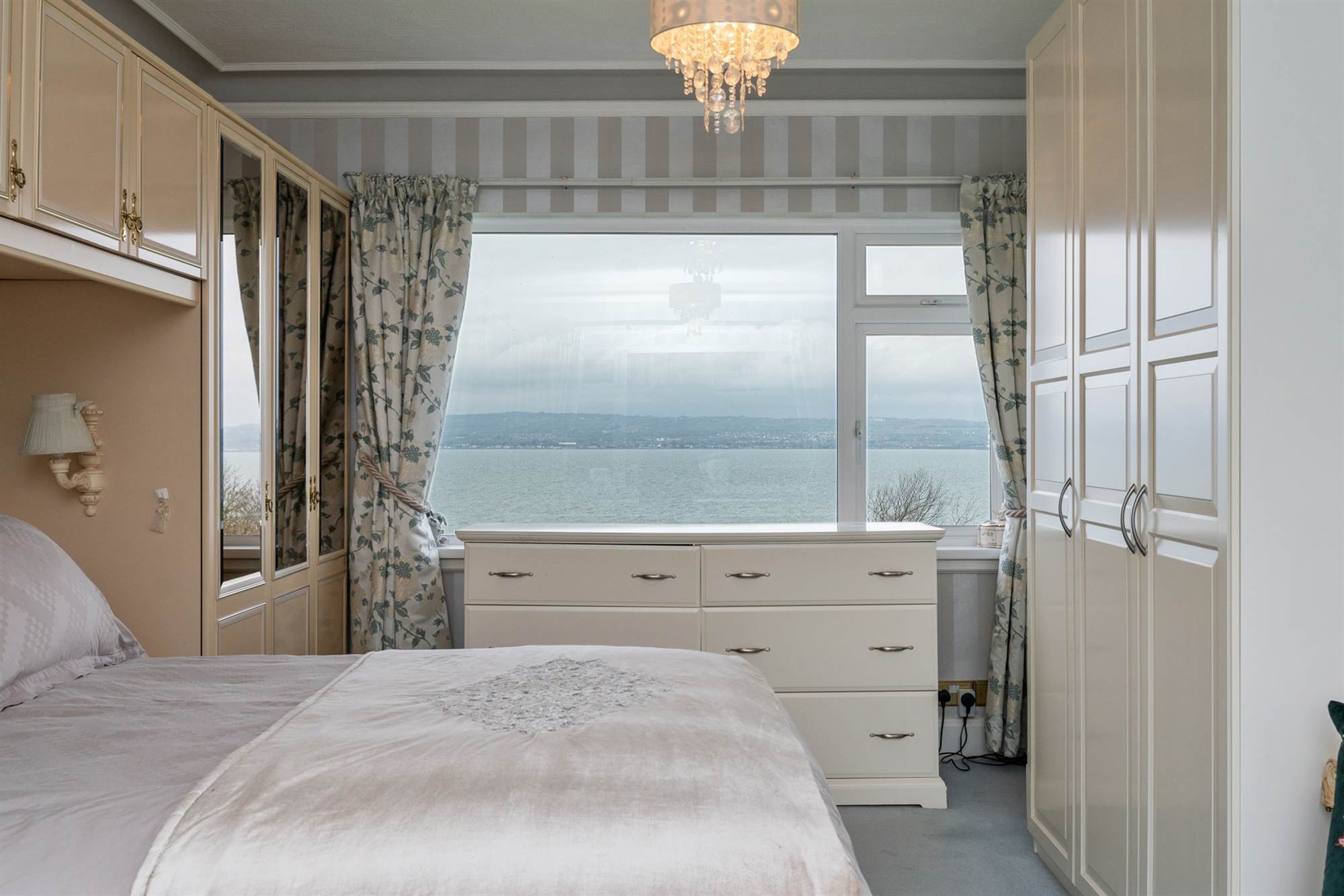 Fitted wardrobes and drawers, large picture window with sea views.