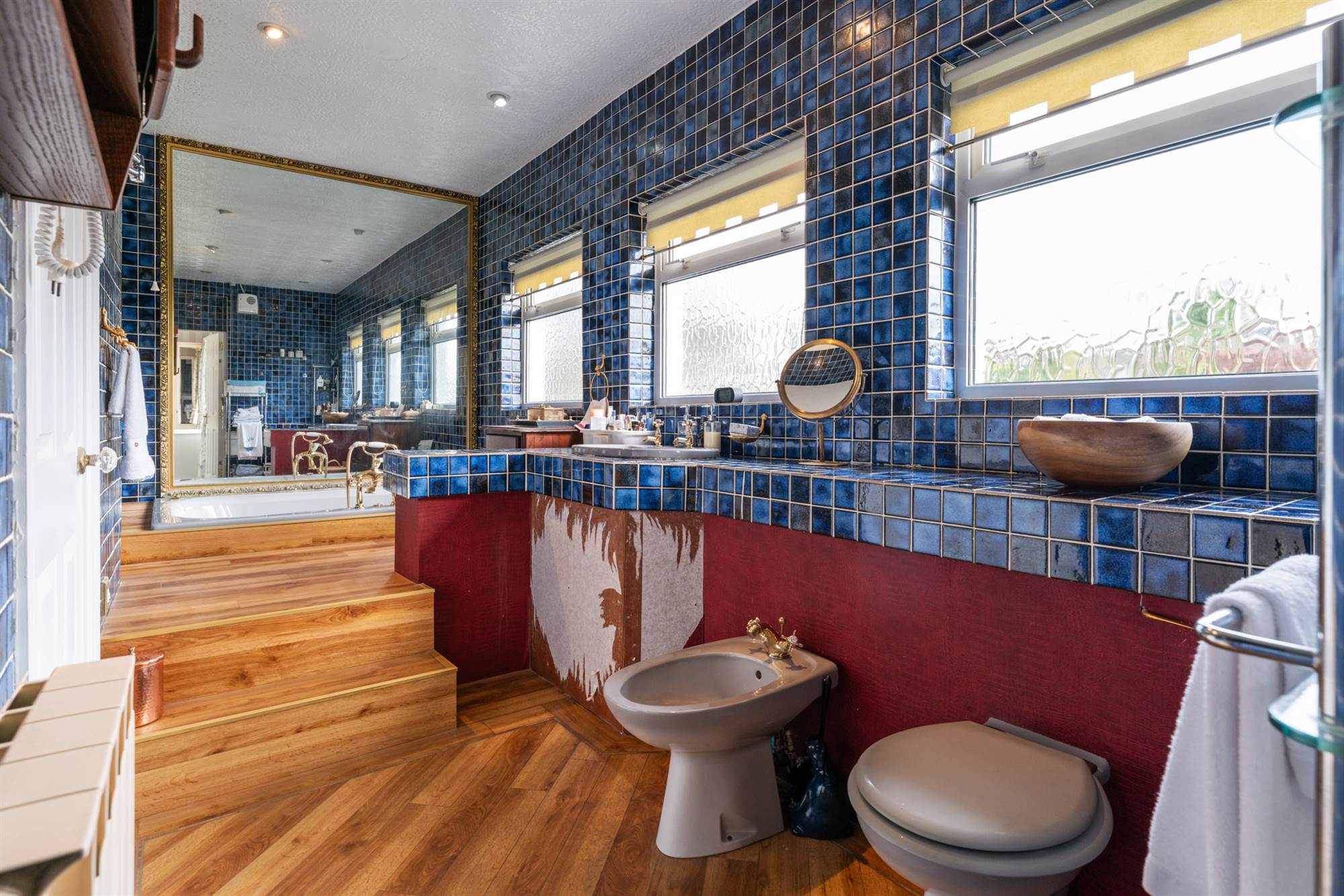 Suite comprising of: WC, bidet, wash hand basin, sunken jacuzzi bath with mixer taps and hand held shower fitment, fully tiled walls, recessed lighting.