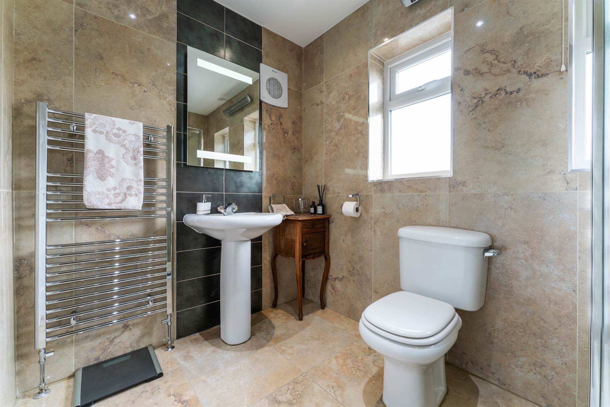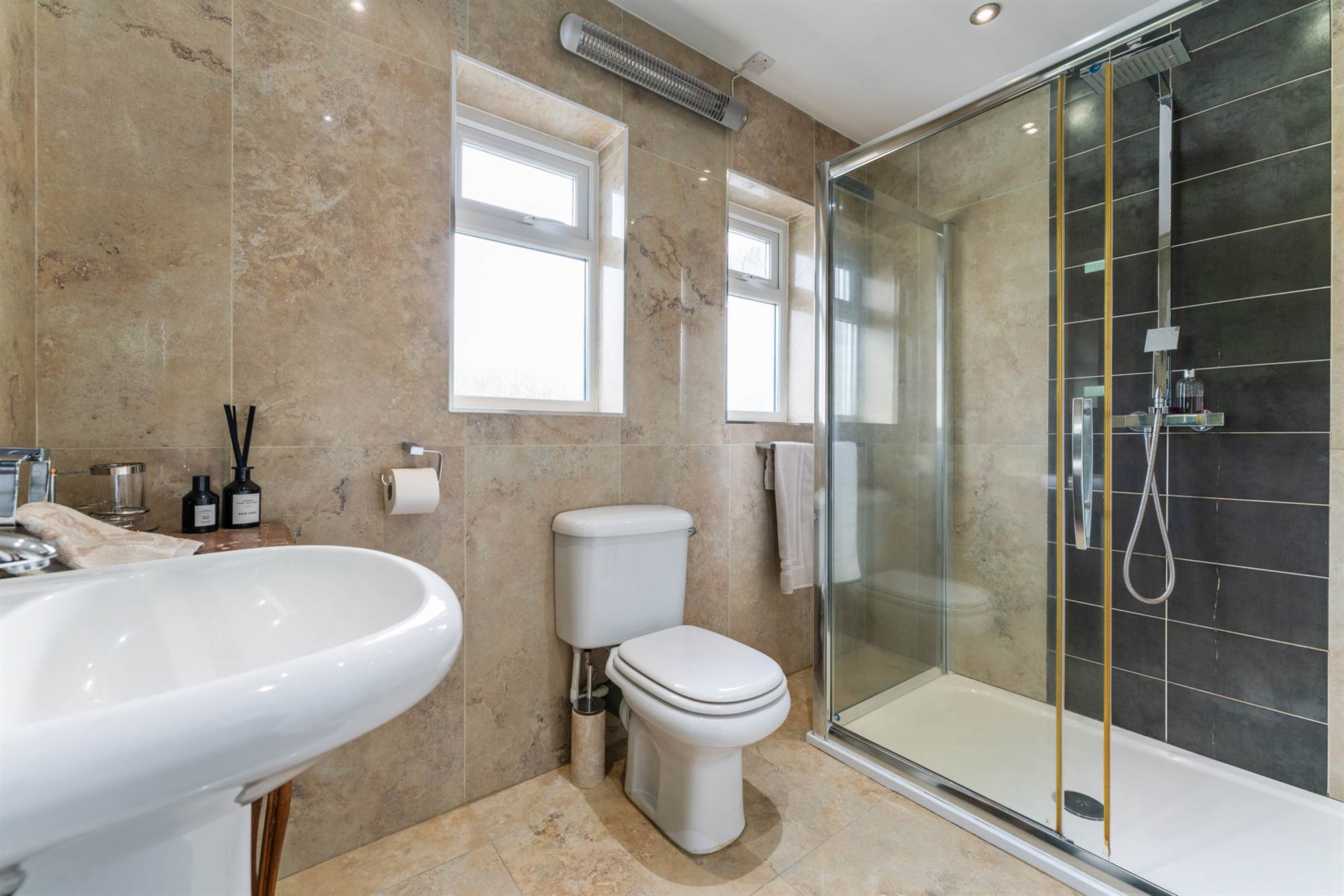 Low flush WC, pedestal wash hand basin, large walk in shower with chrome overhead and hand held fitments, tiled floor, fully tiled walls, chrome heated towel radiator, recessed lighting.