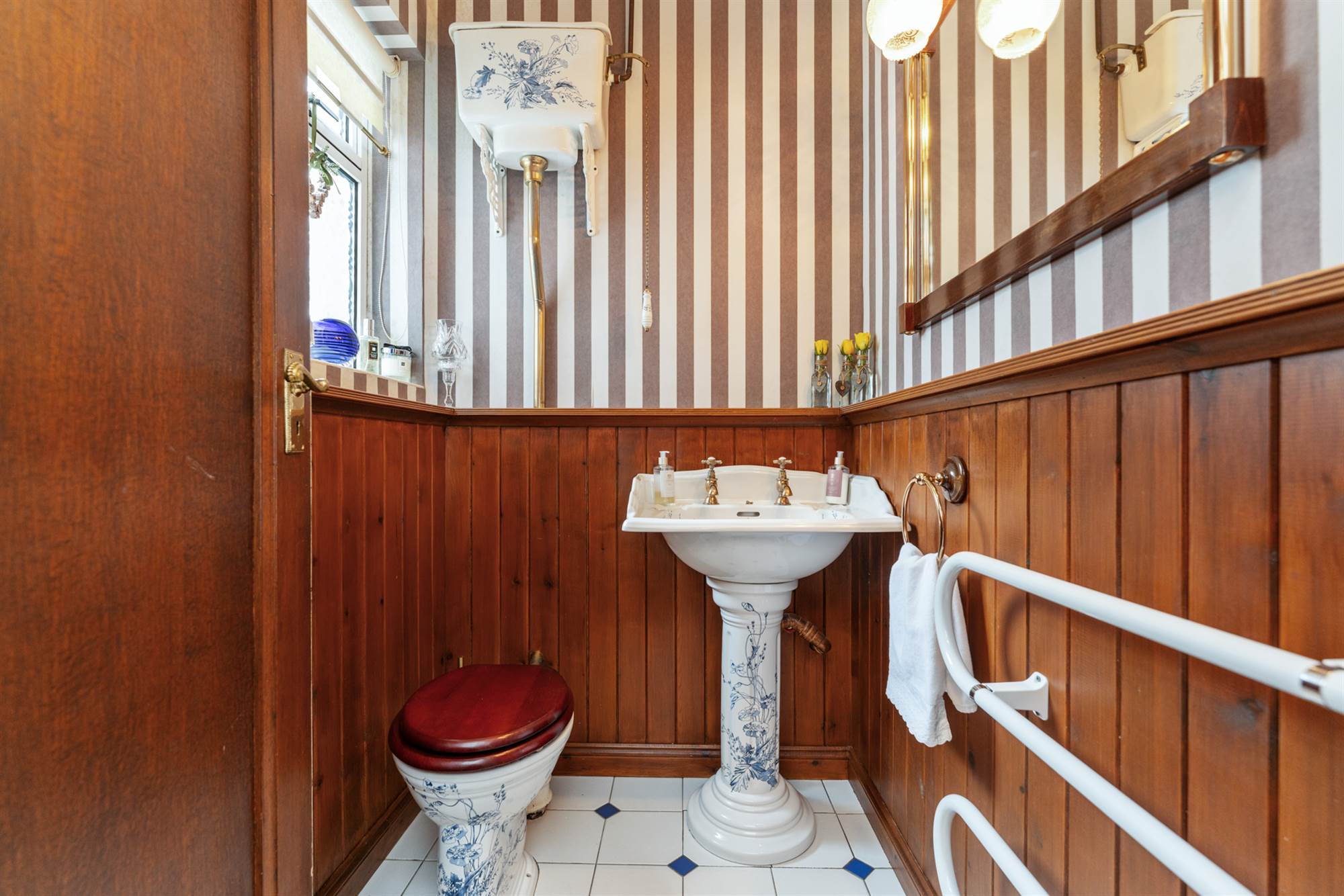 Decorative pedestal wash hand basin and WC, half panelled walls, tiled floor.