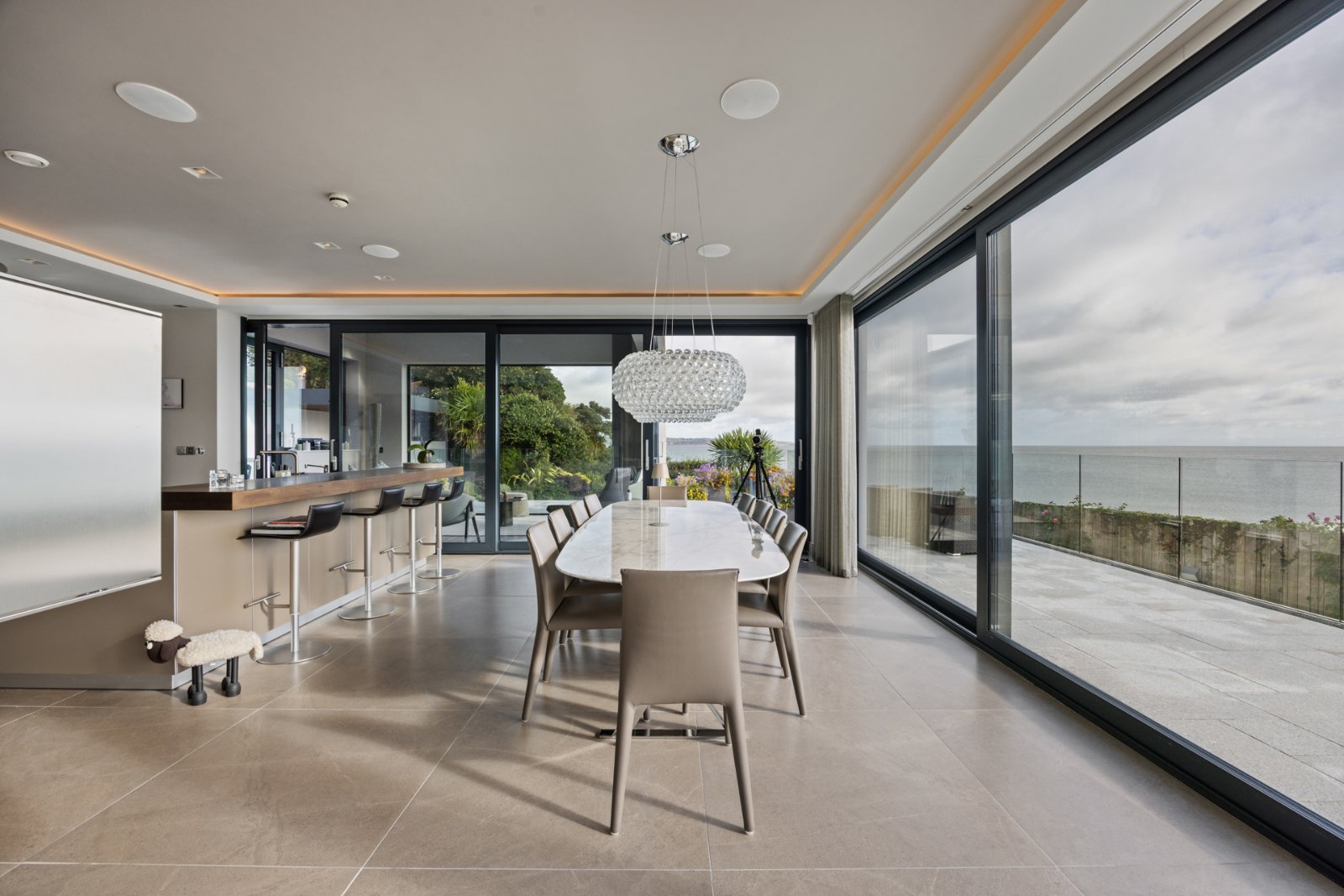 Accommodation is arranged across four levels, with five luxurious bedrooms including a magnificent principal suite. This sanctuary features a private terrace, dressing room, and spa-style bathroom with freestanding bath and walk-in shower, all designed to maximise the dramatic outlook. Additional spaces include a garden room, games and media suite with kitchen, and extensive utility and storage areas, ensuring the home is as practical as it is impressive.
