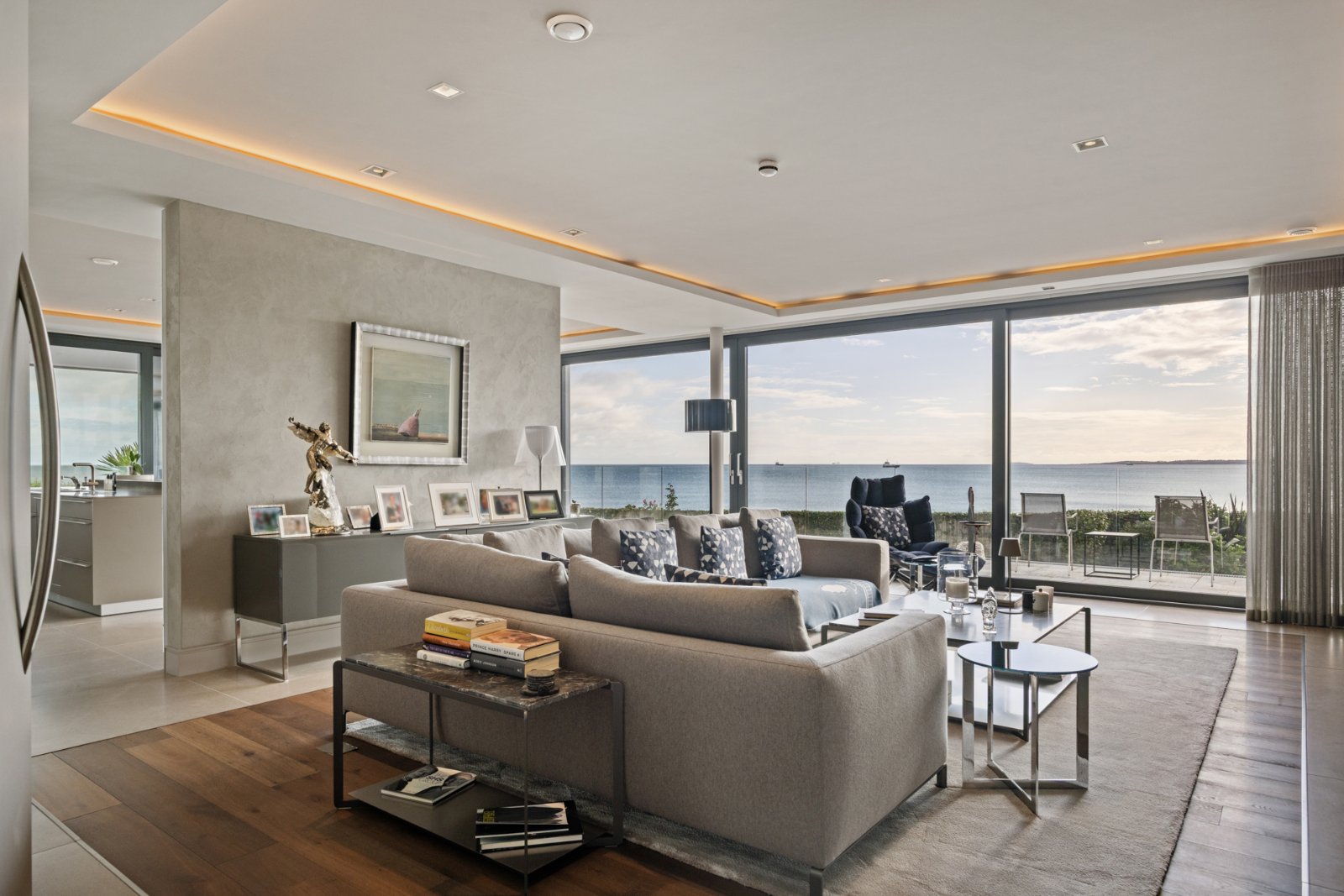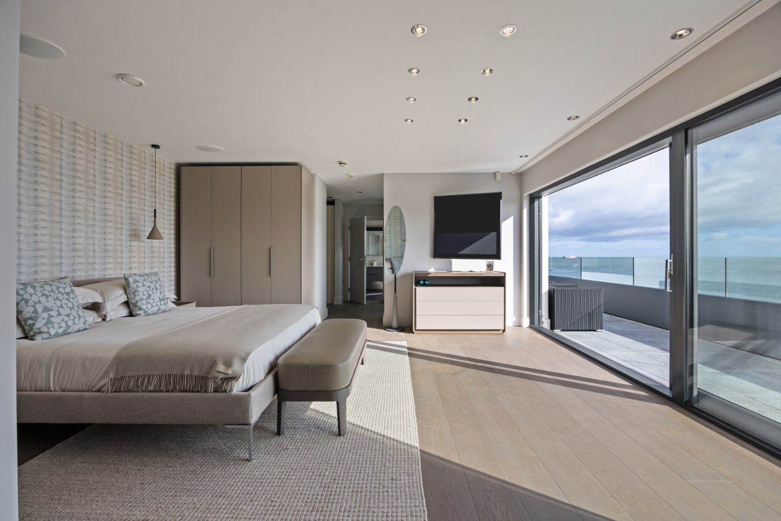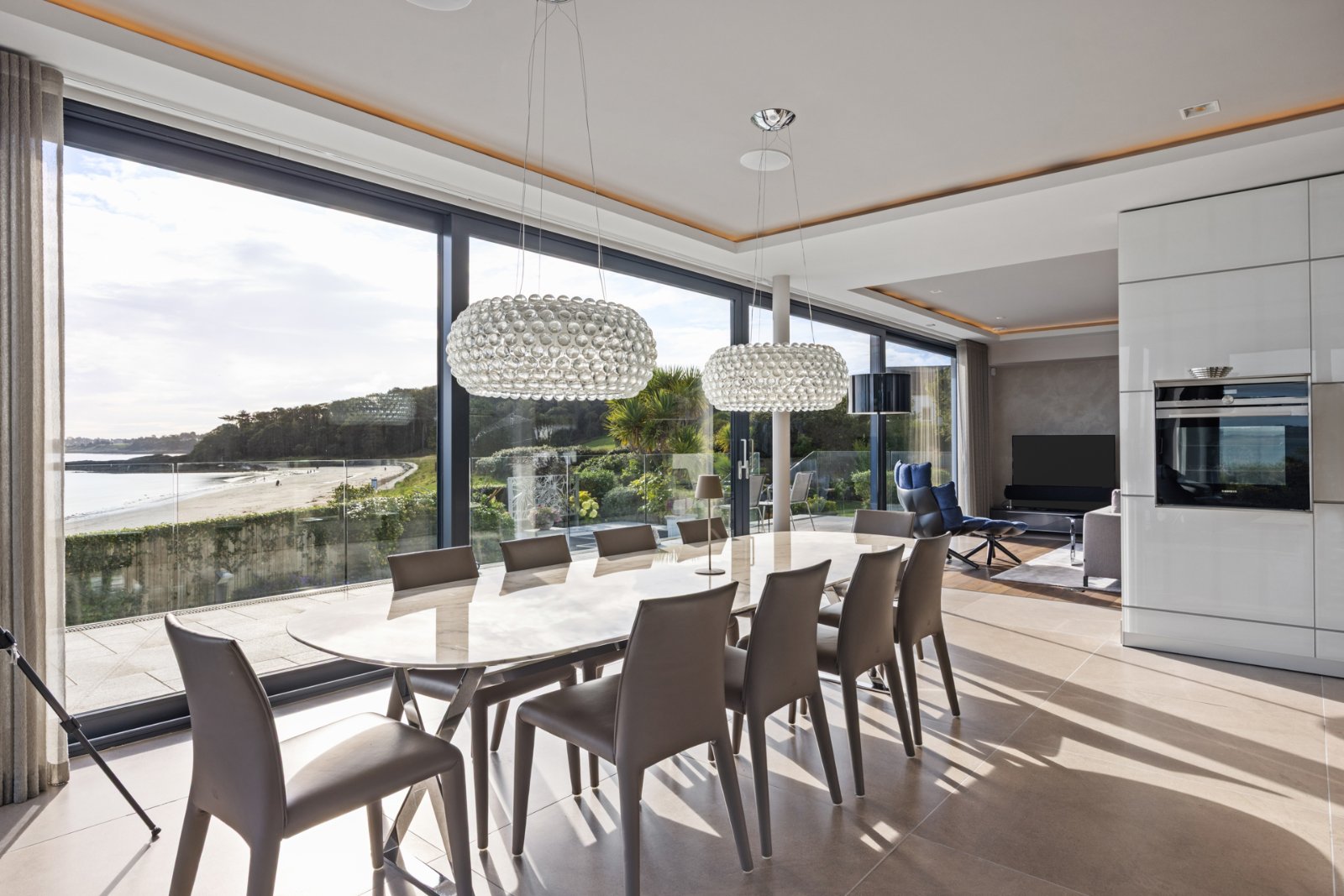 The entrance sets the tone, with a vaulted reception hall, floating staircase, and serving all floors lift. Expansive living spaces flow seamlessly towards the seafront terraces, where walls of glass frame the views. The principal drawing room, elegant living areas and a magnificent Bulthaup kitchen with Siemens appliances all open onto extensive terraces, perfect for entertaining.