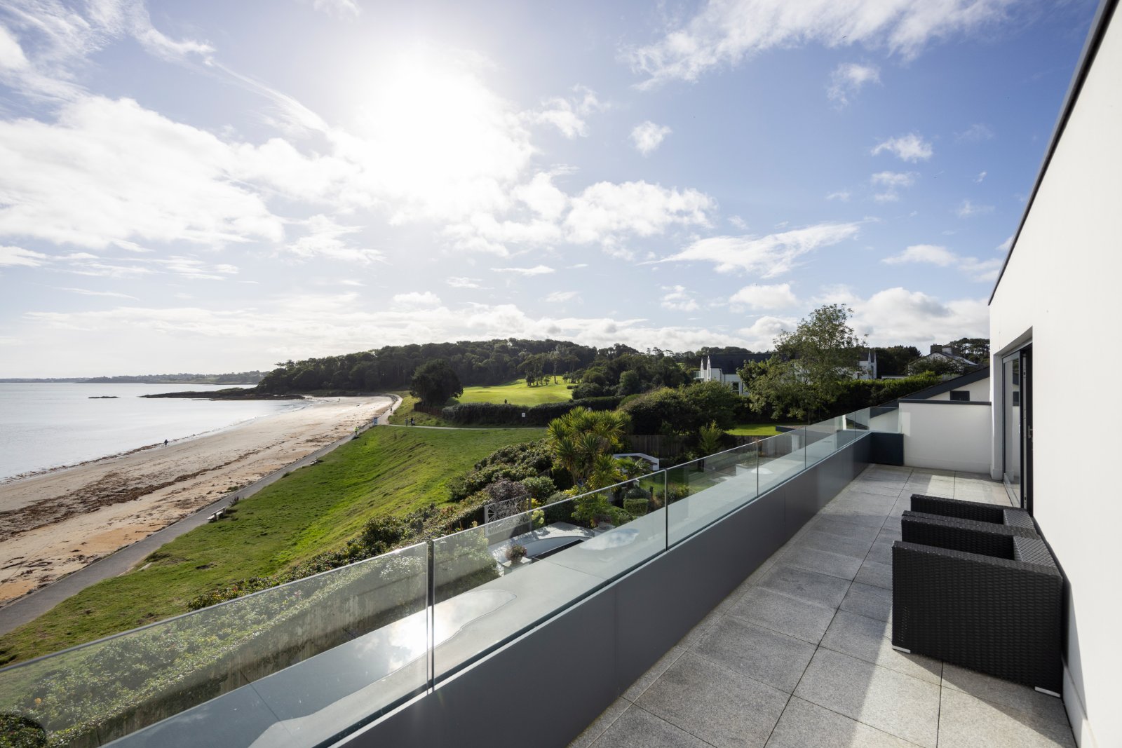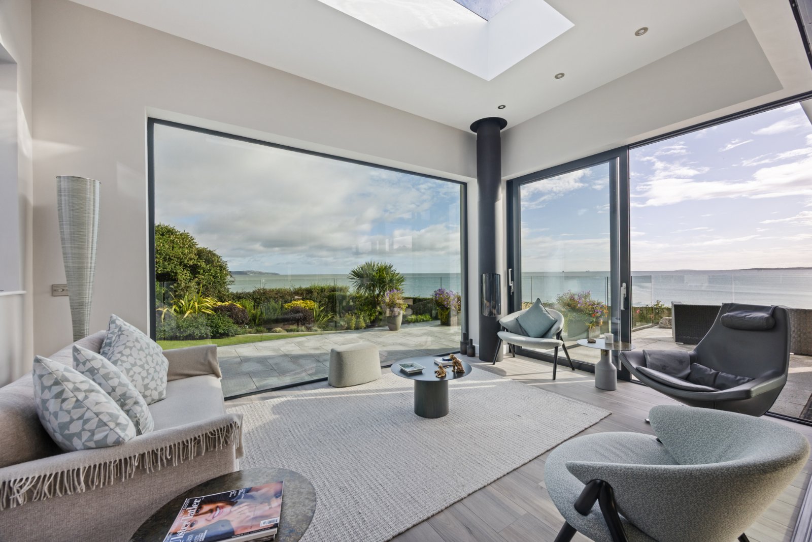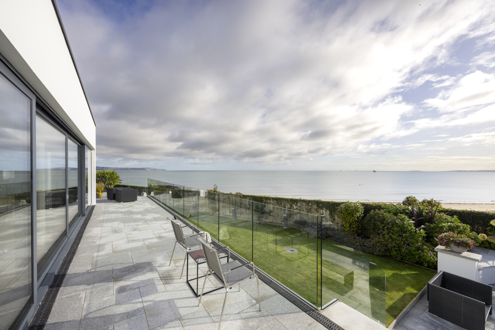 Outside, beautifully landscaped gardens lead directly to the beach. Granite flagged terraces with glass balustrades provide stunning vantage points, while a covered dining area with rooflight, gas fire invites year-round enjoyment. A secluded secret garden offers a tranquil retreat, and an attached garage with generous parking.