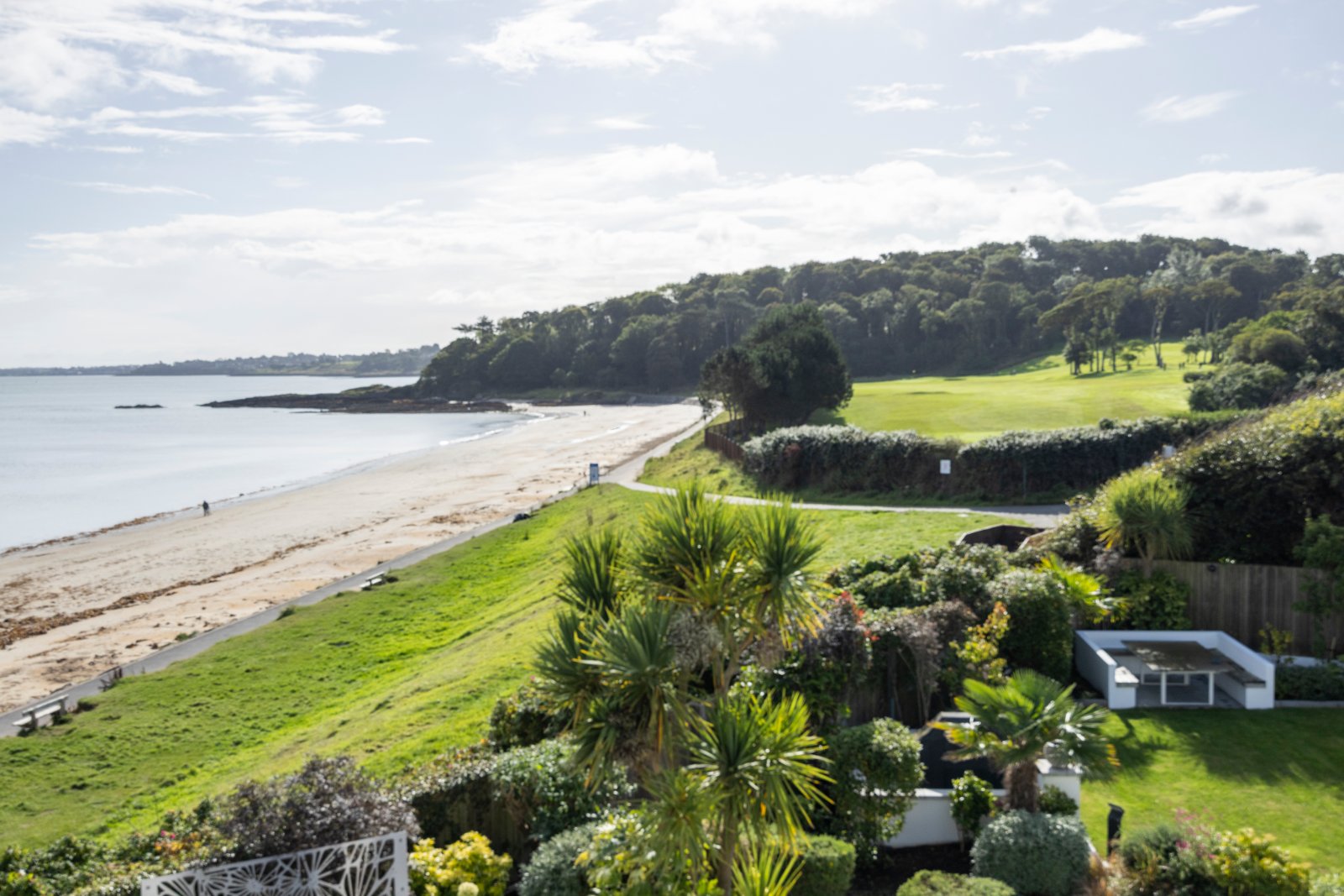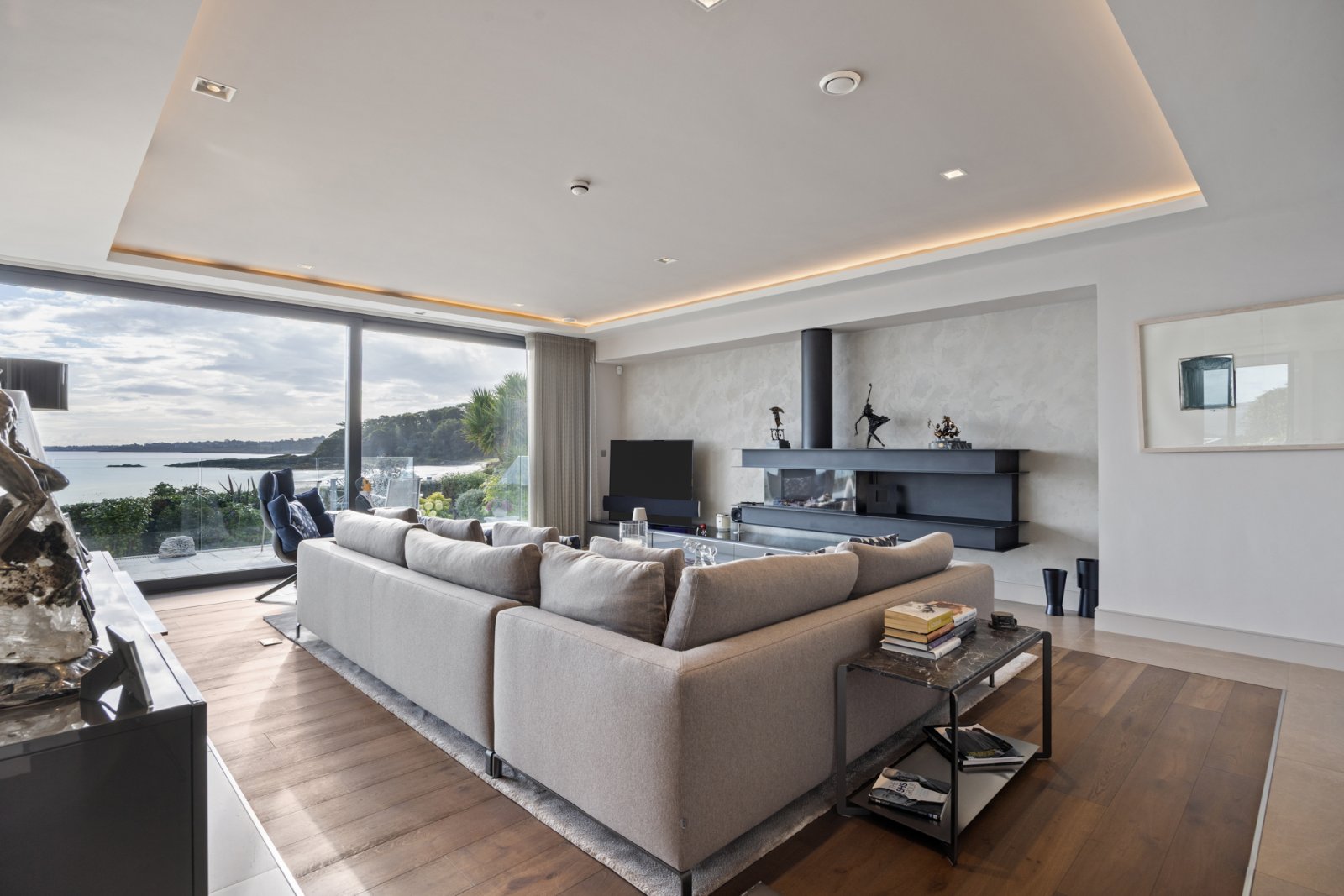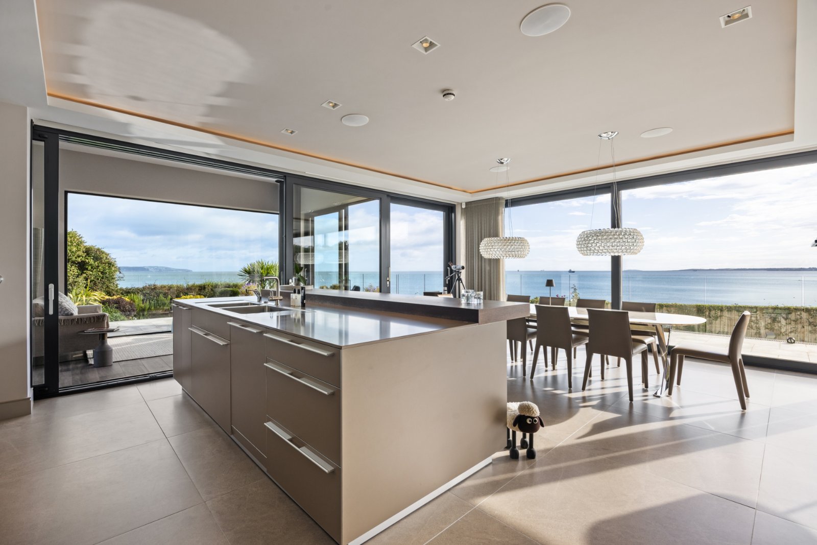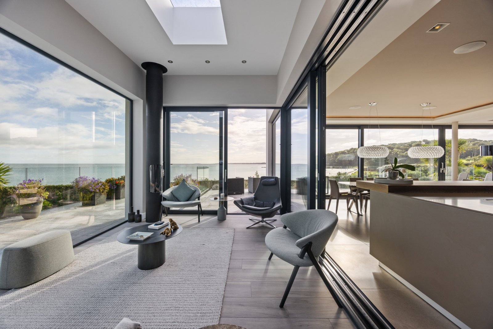 Outside, beautifully landscaped gardens lead directly to the beach. Granite flagged terraces with glass balustrades provide stunning vantage points, while a covered dining area with rooflight, gas fire invites year-round enjoyment. A secluded secret garden offers a tranquil retreat, and an attached garage with generous parking.