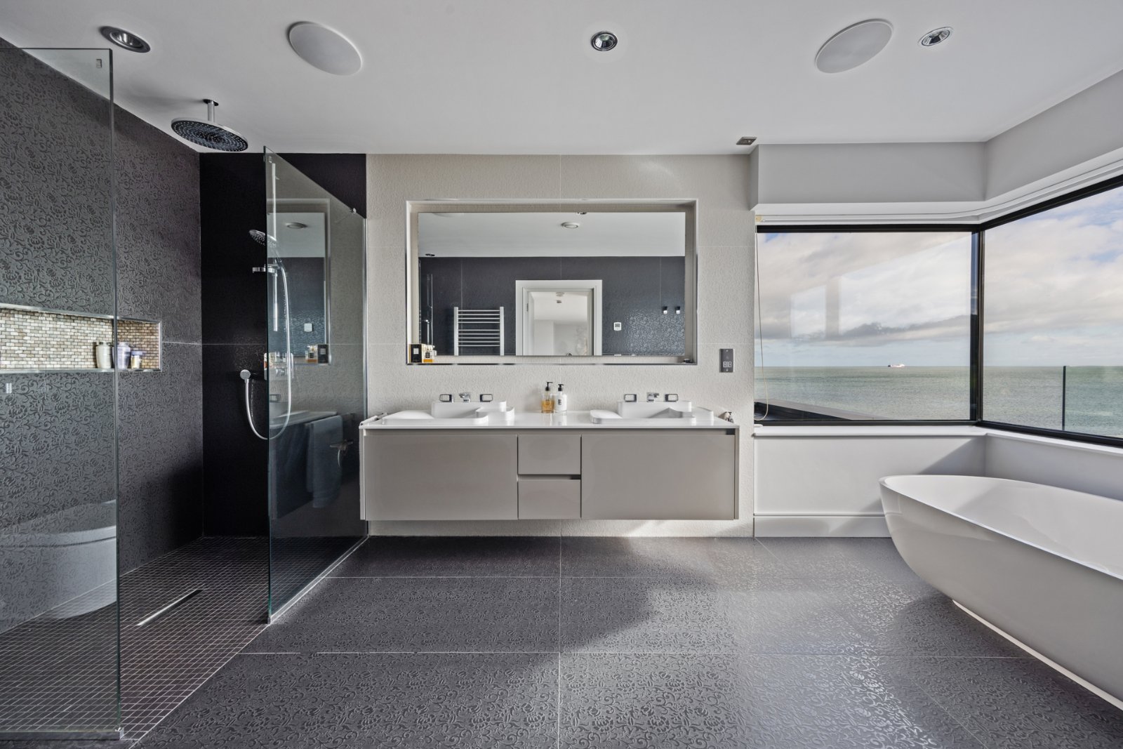 Contemporary white suite comprising: Large walk in shower cubicle, concealed cistern WC, twin sink units with mixer taps, Quartz worktops and shelving below, free standing bath with feature chrome mixer taps, fully tiled walls, ceramic tiled floor, stainless steel towel radiator, recessed lighting, corner window, spectacular uninterrupted views along Helen´s Bay Beach, North Down Coastline to the Copeland Islands and County Antrim shoreline.