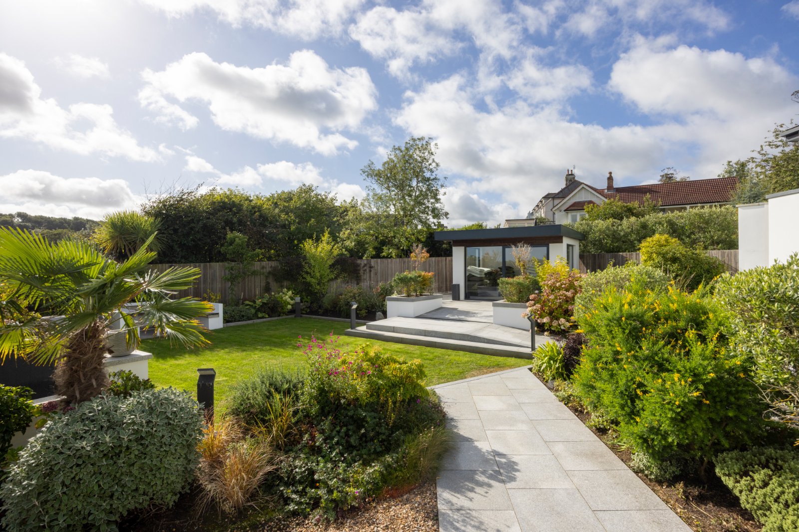 Fully enclosed, manicured and private garden with loose stone pathways and paved patio areas, water feature, lawn in artificial grass, outside lighting, flowerbeds in plants and shrubs.