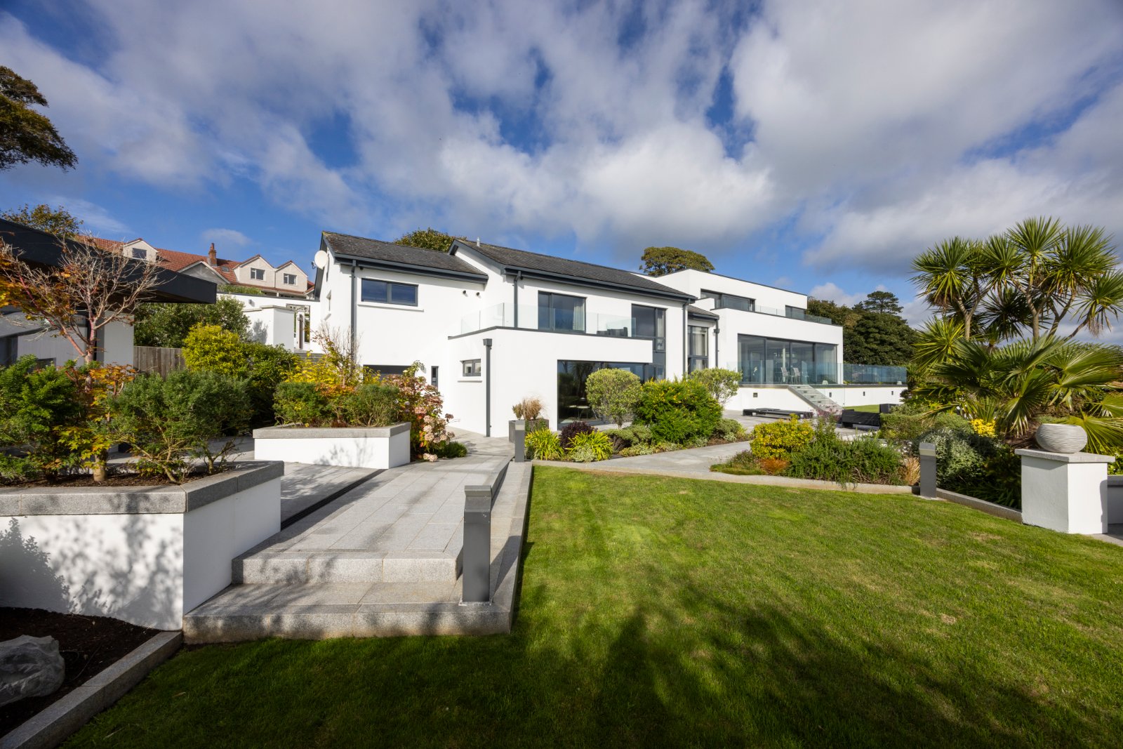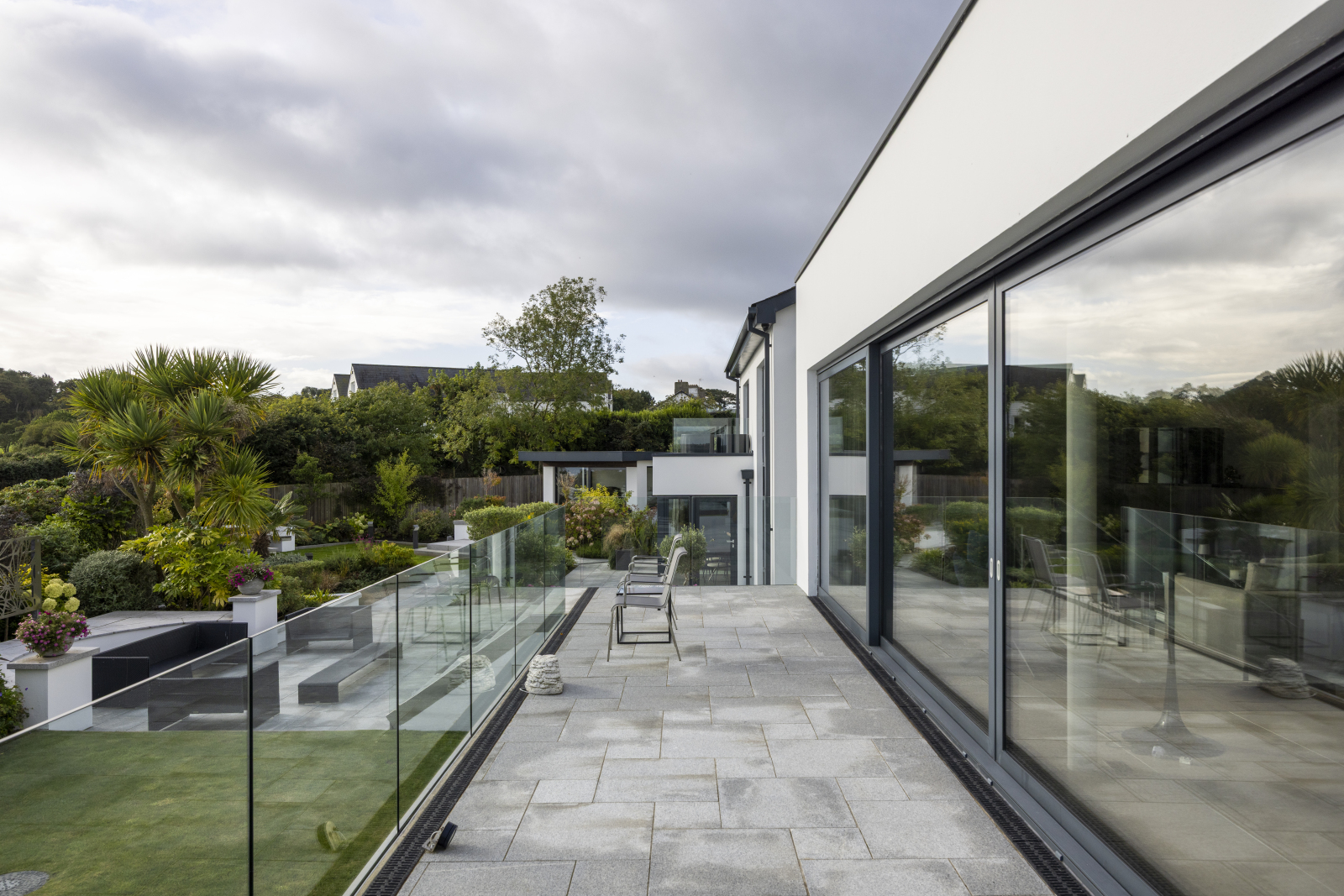 Tegular paved pathway surrounding property, excellent terrace with granite paving and glass balustrade panelling, accessed from main living areas.