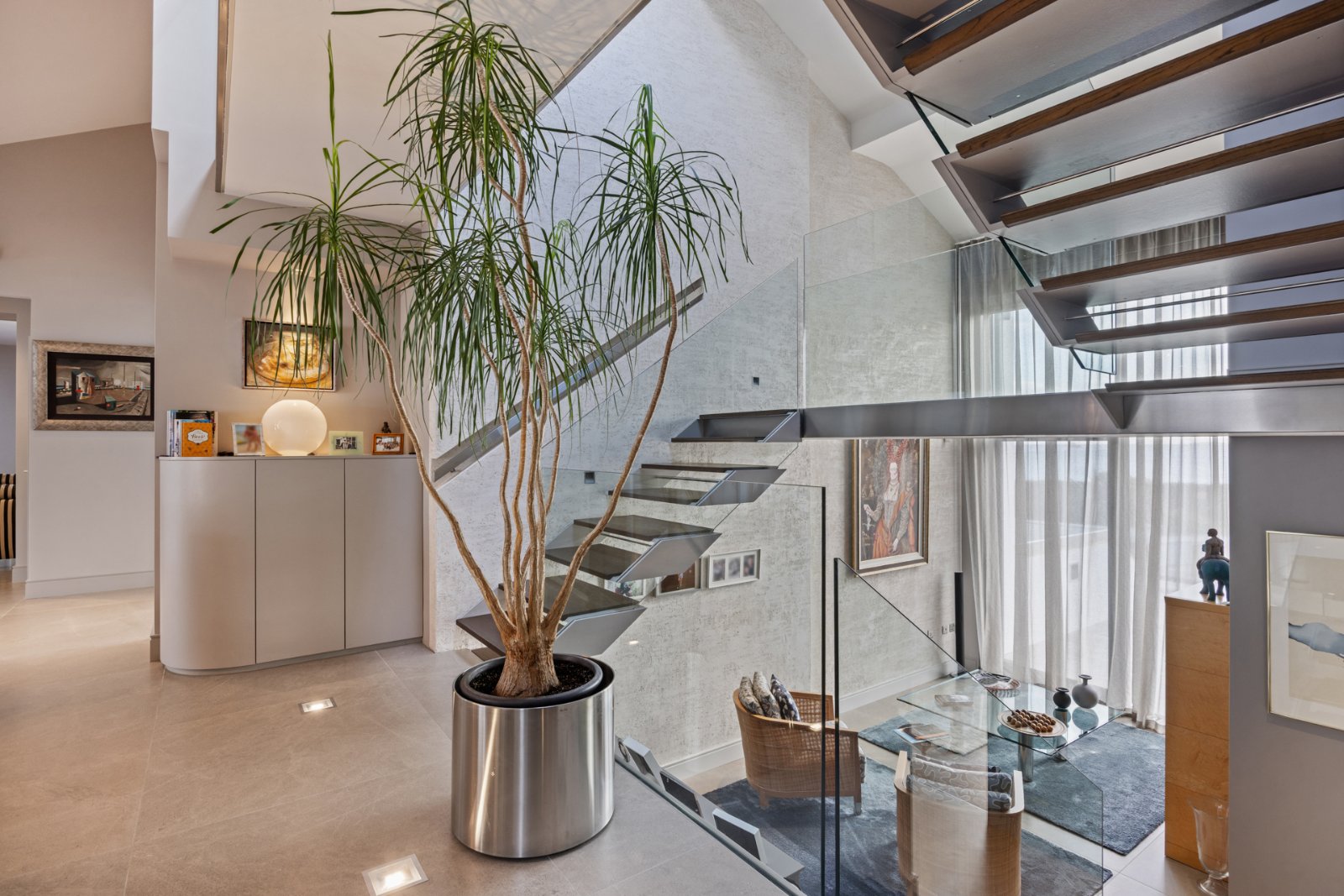Glazed door and side panels from Entrance Porch, vaulted ceiling, magnificent feature floating stairway with glazed balustrade panels, ceramic tiled floor, feature inset gas fire, services and storage cupboards, elevator serving all floors, double opening doors to: