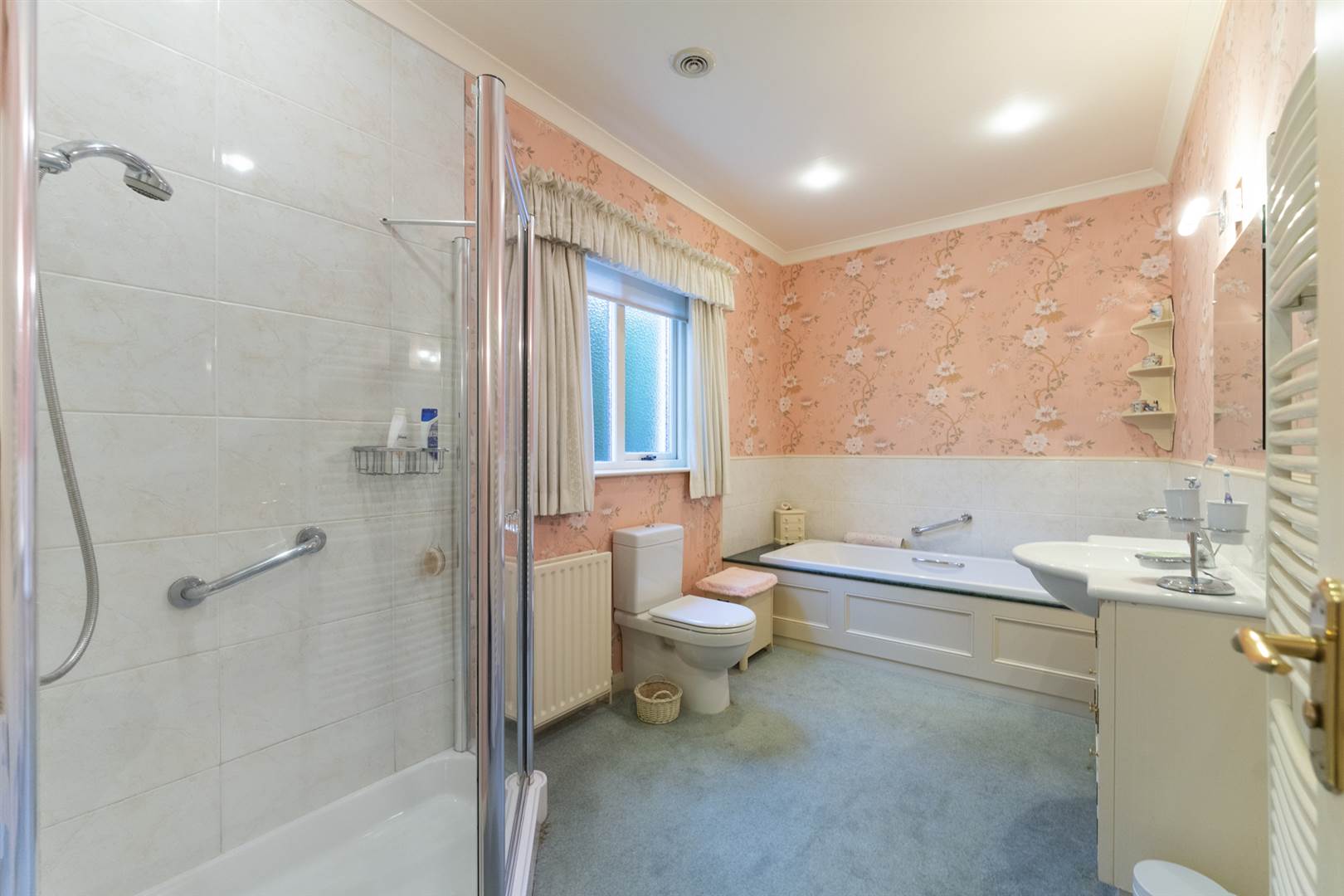 Panelled bath with mixer tap, low flush wc, vanity unit with wash hand basin and mixer tap, part tiled walls, fully tiled corner shower cubicle, extractor fan, recessed lighting, heated towel radiator.