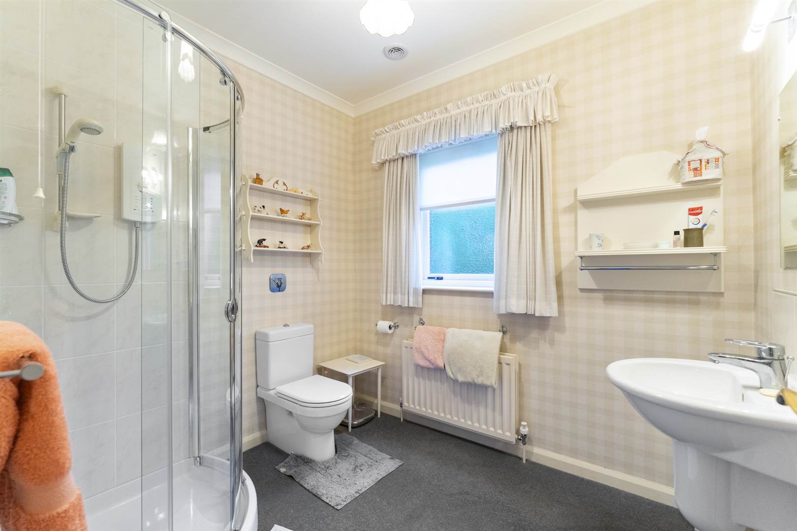 Low flush wc, floating wash hand basin, fully tiled corner shower cubicle with Mira Advantage shower, extractor fan.