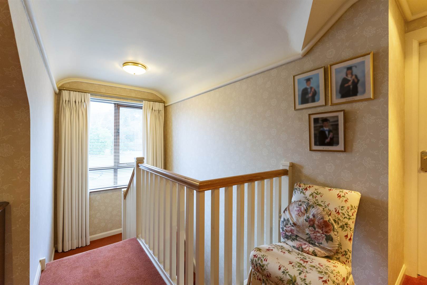 Staircase with painted spindles and hardwood handrail to: